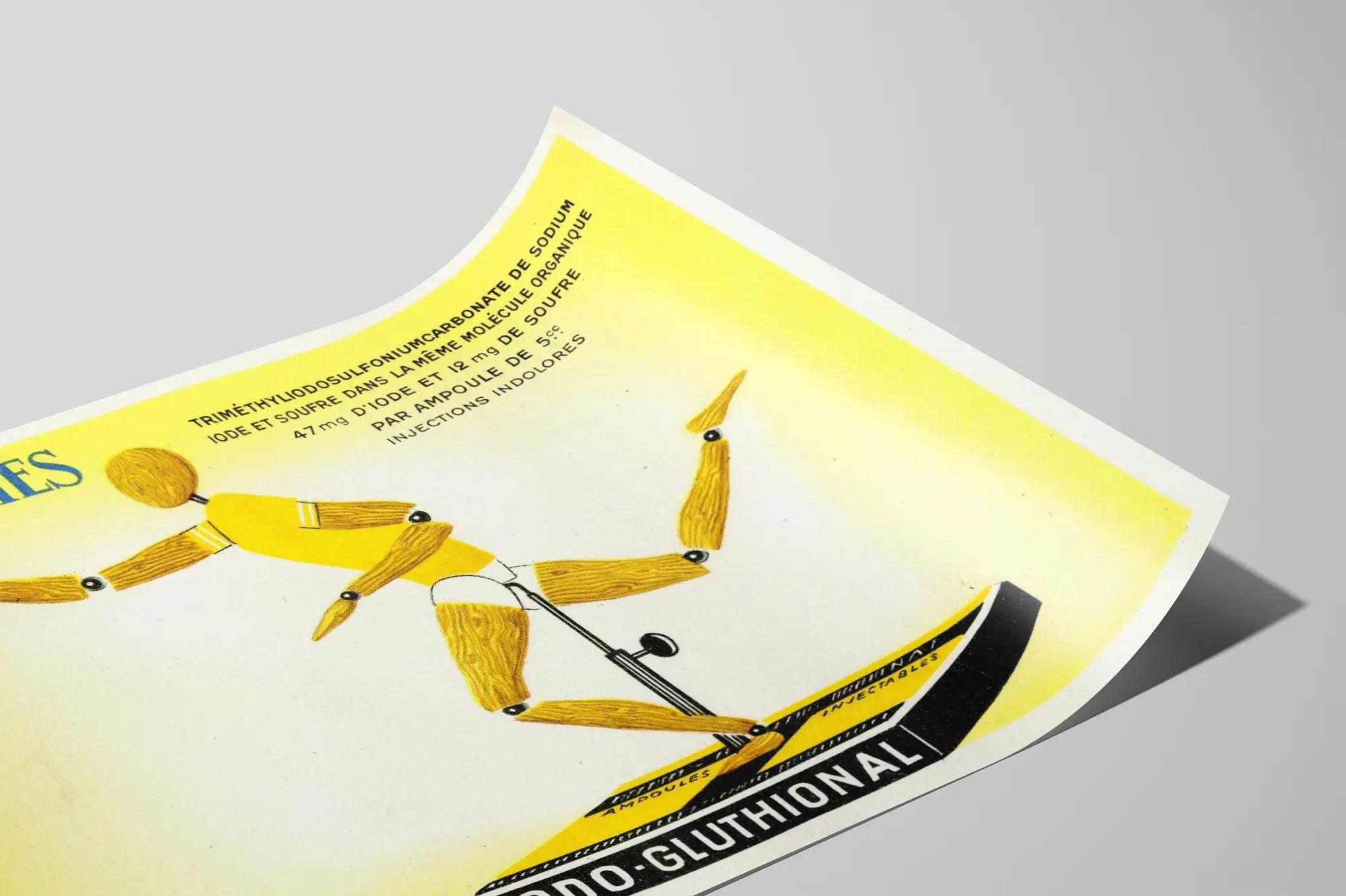 Deze vintage poster toont een gestileerde illustratie van een houten beweegbare figuur die een dynamische houding aanneemt, symboliserend mobiliteit en beweging. Het personage, gekleed in een eenvoudige gele badpak, roept de soepelheid en vloeiendheid van de gewrichten op, een artistiek contrast met het thema van reuma. De heldere gele achtergrond geeft een retro en warme toets aan de muurdecoratie, ideaal voor een ruimte gewijd aan gezondheid, welzijn of geneeskunde.