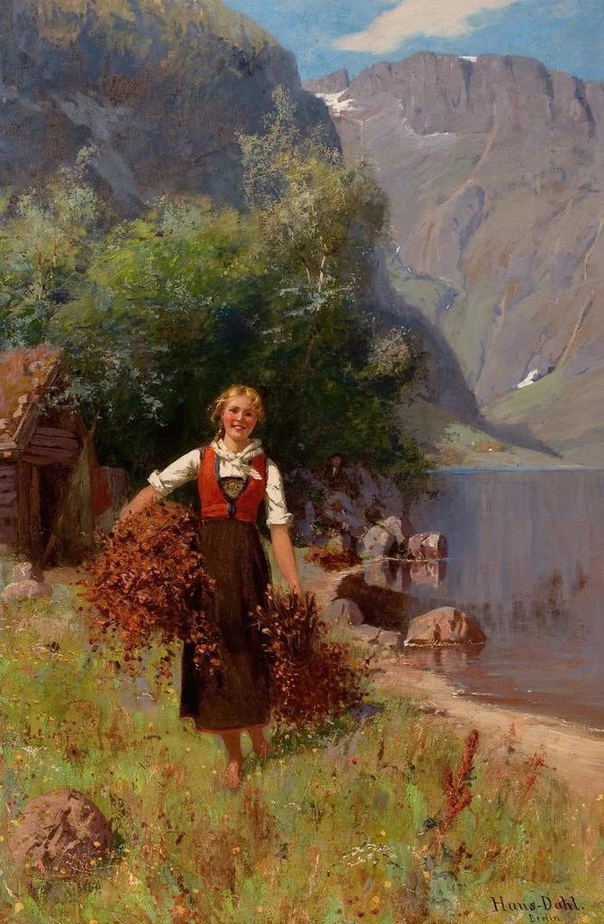 Schilderij Meisje in een fjordlandschap - Hans Dahl | Kunstdruk