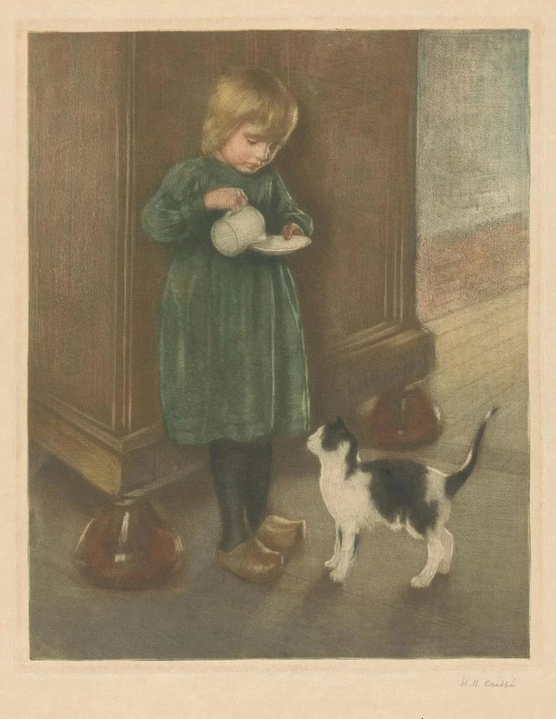 Meisje dat een kat voedt - Heinrich M. Krabbé