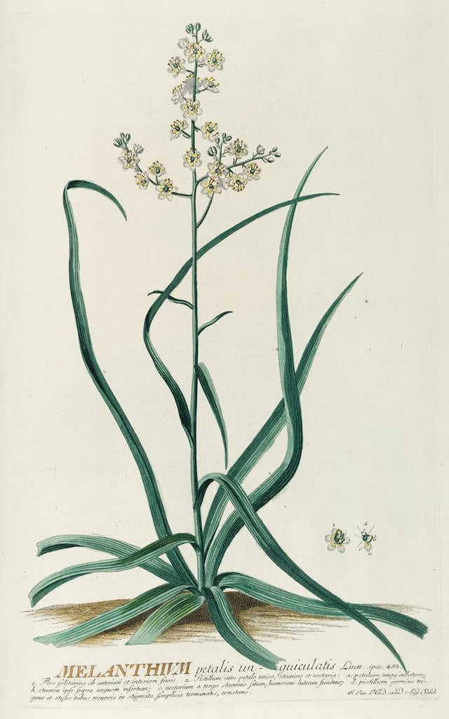 Georg Dionysius Ehret, actief in de achttiende eeuw, is een invloedrijke figuur in de botanische illustratie. Zijn artistieke parcours wordt gekenmerkt door een zoektocht naar precisie en schoonheid, beïnvloed door de wetenschappelijke vooruitgang van zijn tijd. Ehret wist wetenschappelijke nauwkeurigheid te combineren met artistiek gevoel, wat hem in staat stelde werken van grote fijnheid te creëren. Melanthium, zoals veel van zijn creaties, getuigt van zijn uitzonderlijk talent en zijn inzet voor een getrouwe weergave van de flora. Zijn nalatenschap blijft voortleven, en inspireert talloze kunstenaars en wetenschappers door de eeuwen heen.