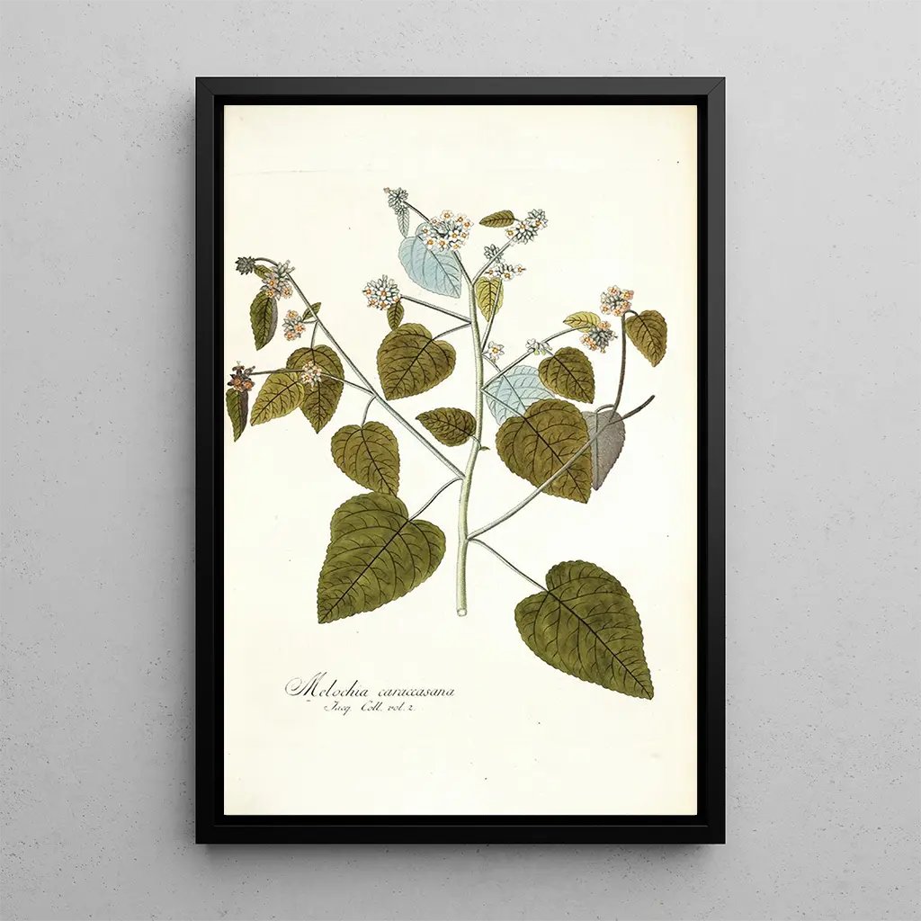 De kunstdruk van Melochia caraccasana, vervaardigd door Nikolaus Joseph Freiherr von Jacquin, dompelt ons onder in een rijke en levendige plantaardige wereld. Dit werk, gekenmerkt door zijn groenachtige tinten en delicate nuances van geel, roept de warmte van tropische klimaten op. De aquareltechniek, met finesse toegepast, eert de lichtheid en transparantie van de bladeren. De sfeer die van dit doek uitgaat, is zowel rustgevend als inspirerend, en nodigt de kijker uit om zich onder te dompelen in de weelderige natuur en de pracht van botanische details te waarderen.