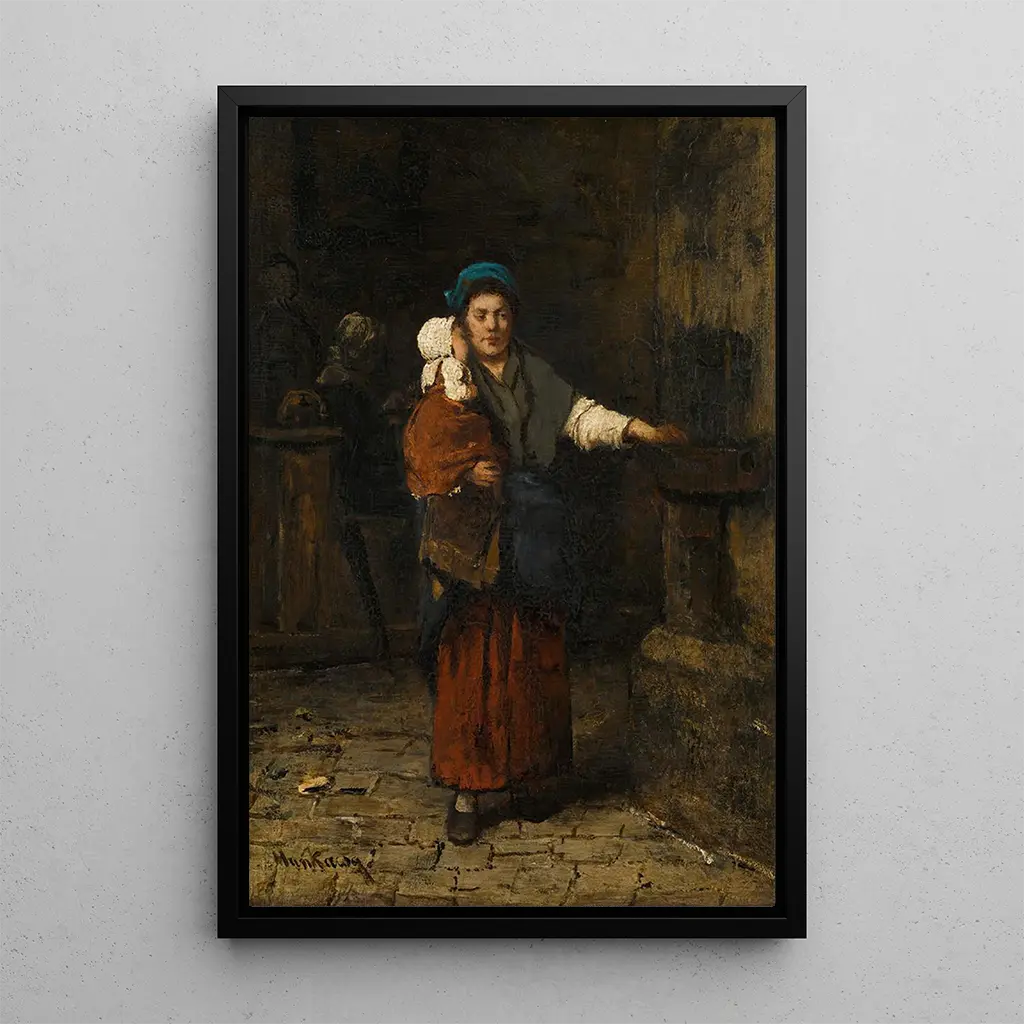 Mihály Munkácsy, geboren in 1844, is een van de meest invloedrijke kunstenaars van de realistische beweging in Hongarije. Opgeleid aan de Kunstacademie van München, werd hij sterk beïnvloed door grote Europese meesters, waaronder Rembrandt en Courbet. Zijn carrière, gekenmerkt door iconische werken, was gewijd aan het weergeven van het dagelijks leven en menselijke emoties. "Moeder en kind" past in een periode waarin de kunst zich richt op meer persoonlijke en intieme thema's, die de sociale en familiale zorgen van zijn tijd weerspiegelen. Munkácsy wist de essentie van het leven vast te leggen met een unieke gevoeligheid, waardoor hij een onmisbare figuur is geworden in de Hongaarse kunst.