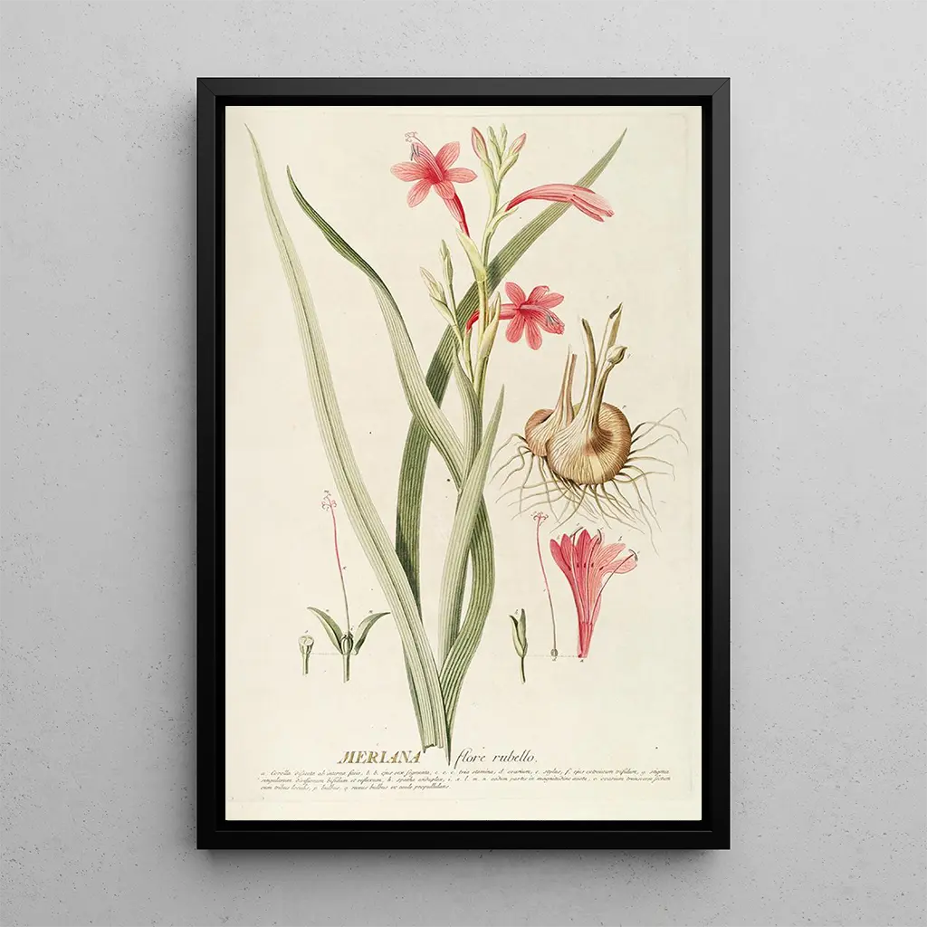 De kunstdruk van het werk Meriana van Georg Dionysius Ehret dompelt ons onder in een wereld waar de natuur met glans bloeit. Dit doek, rijk aan details, benadrukt delicate bloemen met levendige kleuren, schommelend tussen zachtroze en stralend geel. De aquareltechniek, beheerst door de kunstenaar, geeft het geheel een luchtige, bijna dromerige lichtheid. De sfeer die uit dit werk straalt, nodigt uit tot contemplatie, waardoor de kijker kan ontsnappen naar een weelderige tuin, waar elke bloemblad een verhaal lijkt te vertellen.