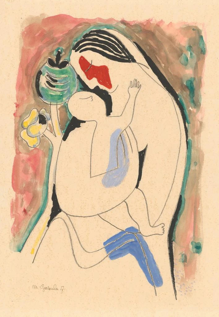 Kunstdruk | Moeder met baby en bloem - Mikuláš Galanda