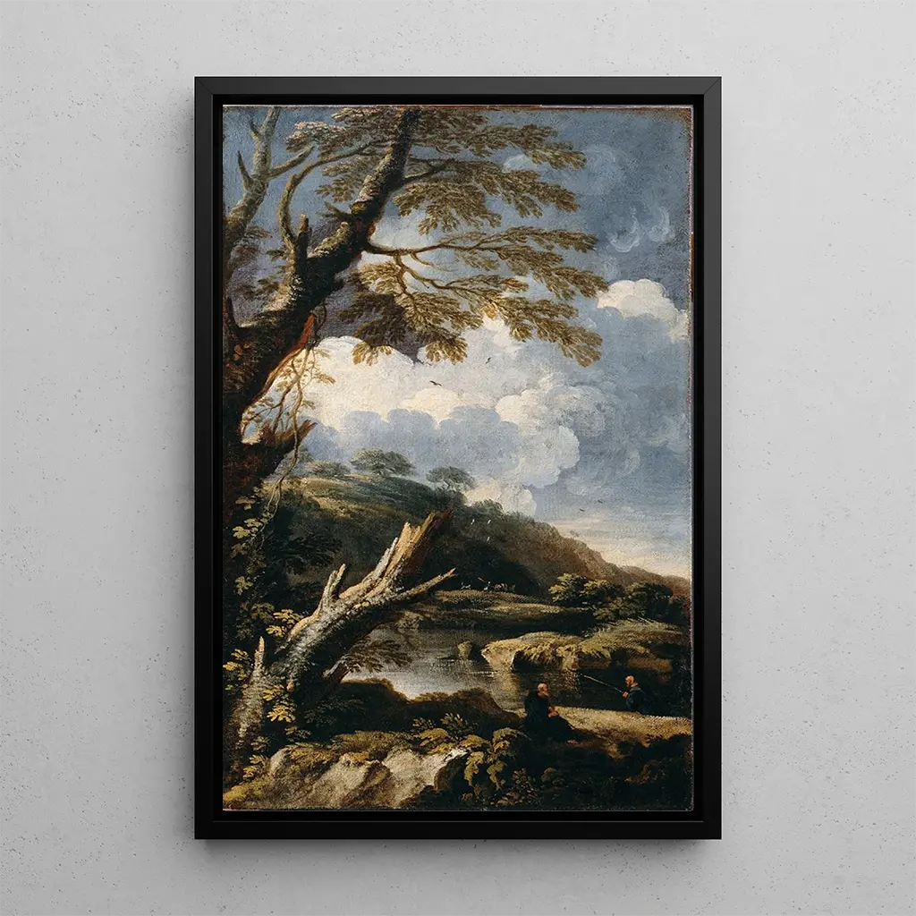 In het werk "Moeder Teresa" dompelt Salvador Rosa ons onder in een vredige wereld waar natuur en spiritualiteit samenkomen. De compositie benadrukt monniken, meditatieve silhouetten, aan de rand van een rustige rivier, omringd door weelderige landschappen. De kleuren, variërend van diepe groenen tot rustgevende blauwen, creëren een sfeer van kalmte en reflectie. De techniek van Rosa, die vaardig chiaroscuro en de precisie van details combineert, brengt deze scène tot leven en nodigt de kijker uit zich onder te dompelen in dit hangende moment. Elke penseelstreek lijkt een verhaal van devotie en gemeenschap met de natuur te fluisteren.