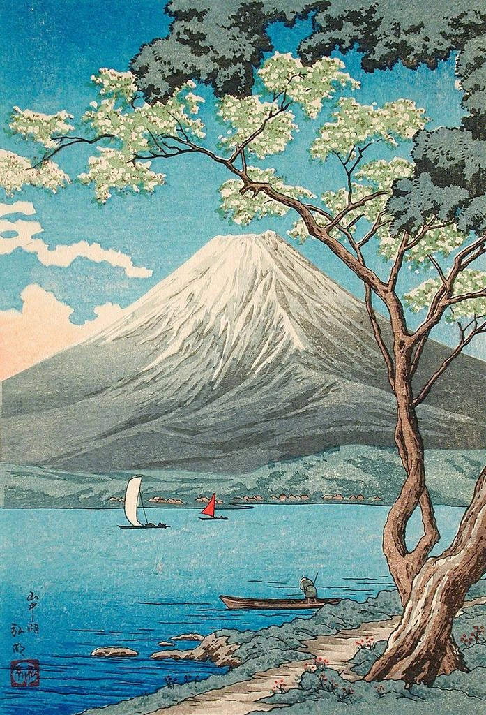 La toile "Mont Fuji depuis le lac Yamanaka" évoque une tranquillité majestueuse. Les teintes douces du ciel se mêlent aux reflets argentés du lac, tandis que le Mont Fuji, symbole emblématique du Japon, se dresse avec grâce en arrière-plan. La technique de Takahashi Hiroaki, connue pour ses impressions sur bois, confère à cette œuvre une profondeur et une texture uniques. L'atmosphère paisible invite à la contemplation, transportant le spectateur au cœur de la nature japonaise, où chaque détail semble capturer l'essence d'un moment fugace.