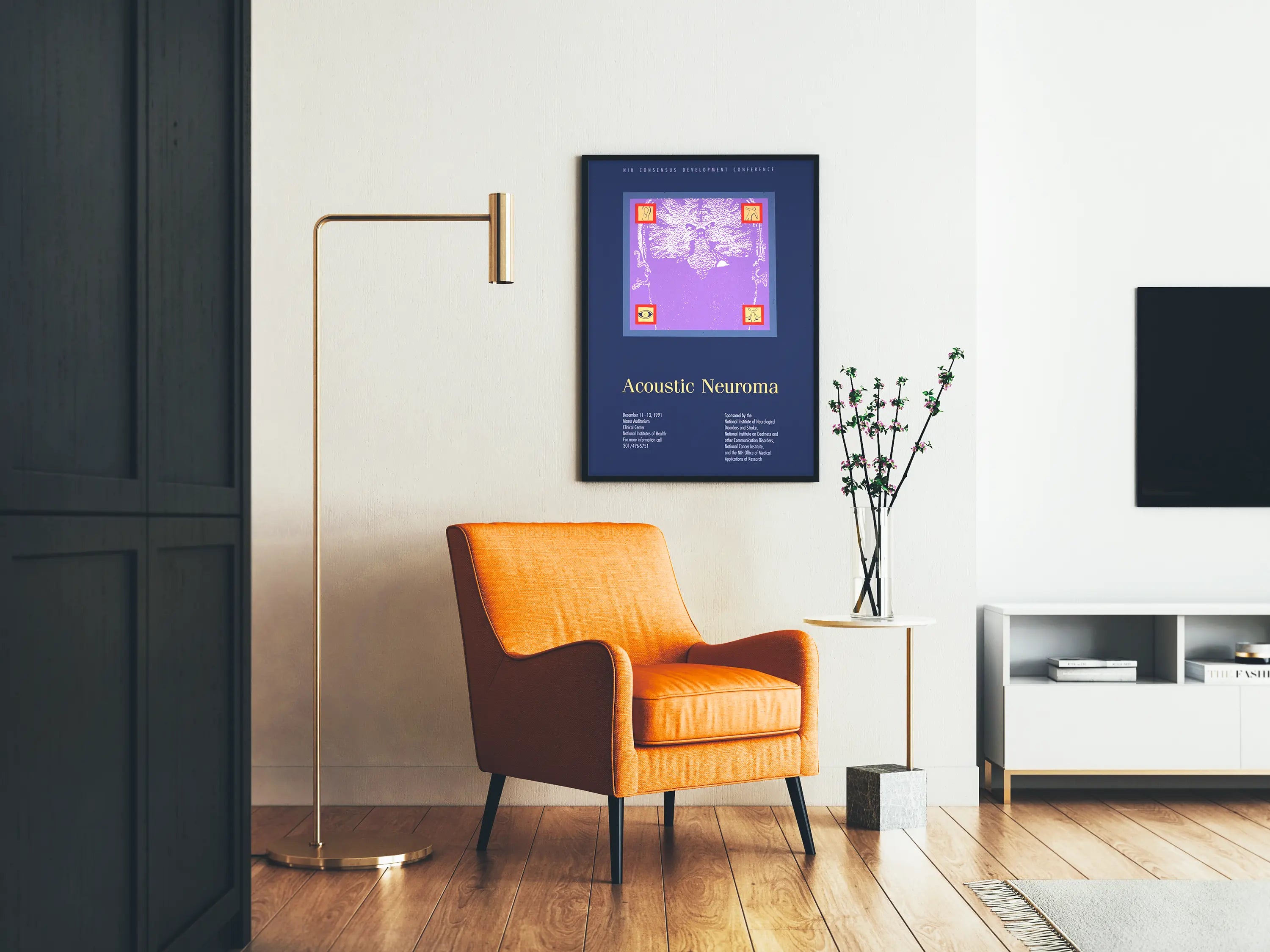 Deze muurdecoratie haalt haar stijl uit een heldere en eenvoudige visuele compositie, aangevuld met een sobere en elegante typografie in lichtgeel die de titel "Acoustic Neuroma" benadrukt. Ook zijn er verklarende vermeldingen die aangeven dat deze affiche verwijst naar een conferentie die plaatsvond van 11 tot 13 december 1991 in de Masur Auditorium, Clinical Center, National Institutes of Health. Daarnaast wordt de steun vermeld van prestigieuze medische organisaties zoals het National Institute of Neurological Disorders and Stroke, het National Institute on Deafness and Other Communication Disorders, het National Cancer Institute en het NIH Office of Medical Applications of Research.
