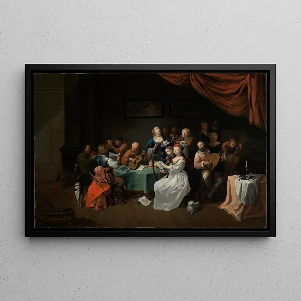 De kunstdruk van "Muziekvermaak" dompelt ons onder in een wereld waar muziek en kunst samenkomen in een sprankelende harmonie. De levendige kleuren en de dynamische vormen van het doek roepen een feestelijke sfeer op, vol leven en energie. De personages, gekleed in opvallende kostuums, lijken te dansen op het ritme van de melodieën, waardoor een levendige scène ontstaat die de aandacht trekt. Elk detail, van muziekinstrumenten tot de vrolijke uitdrukkingen van de musici, draagt bij aan een feestelijke sfeer en nodigt de kijker uit om de magie van muziek te voelen door middel van visuele kunst.
