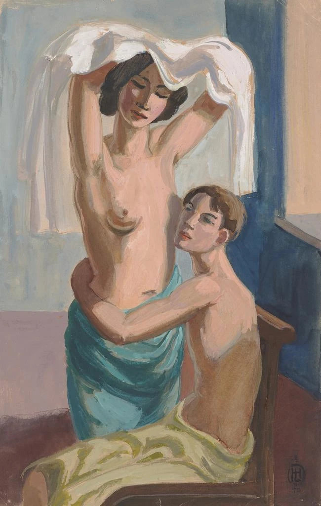 Kunstdruk | Man zittend en omarmend een naakte vrouw staand - Hermann Lismann