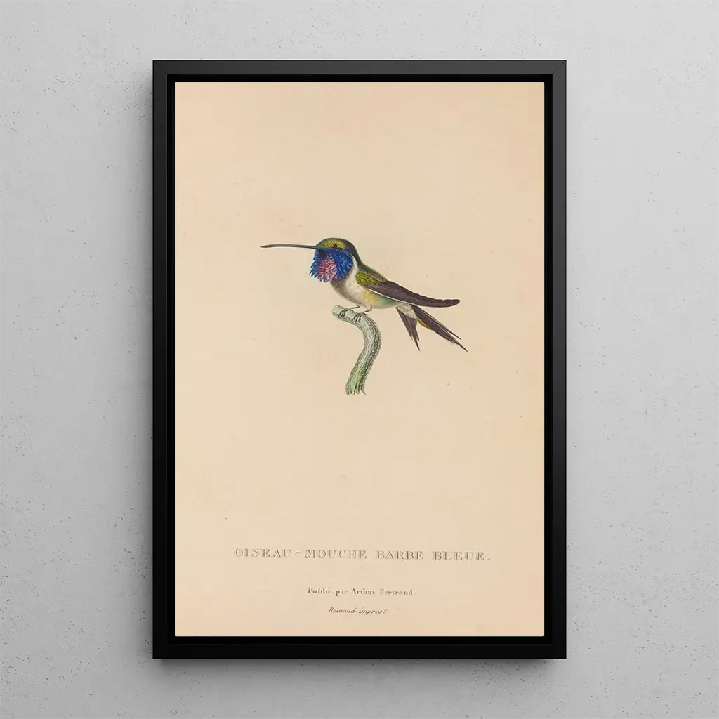De kunstdruk Histoire naturelle des oiseaux-mouches Pl05 dompelt ons onder in een kleurrijk en fascinerend universum. De levendige tinten van de verenkleed, variërend van diepe blauwen tot heldere roodtinten, roepen de rijkdom van de vogelbiodiversiteit op. Elk vogel, met een minutieuze precisie afgebeeld, lijkt tot leven te komen op het doek, dankzij de delicate aquareltechniek die het mogelijk maakt om het licht en de textuur van de veren vast te leggen. De sfeer die uit dit werk straalt, is zowel vrolijk als contemplatief, en nodigt de kijker uit om de vergankelijke schoonheid van deze gevleugelde wezens te waarderen.