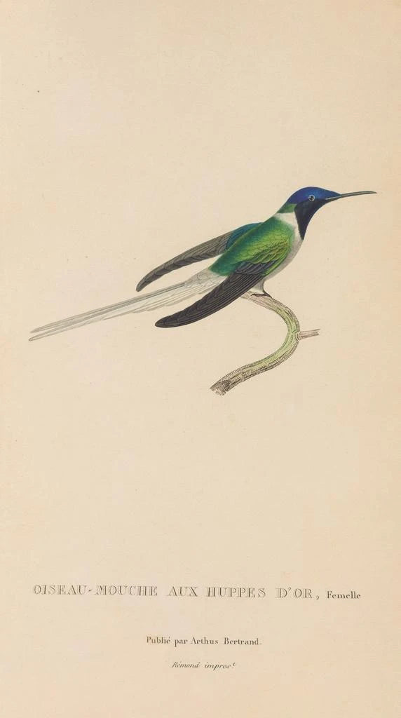René Primevère Lesson, natuuronderzoeker en illustrator uit de 19e eeuw, speelde een essentiële rol in de studie van vogels. Zijn passie voor de natuur en zijn scherp observatievermogen stelden hem in staat werken te creëren die wetenschap en kunst combineren. Geïnspireerd door de ontdekkingen van zijn tijd, wist hij de essentie van de soorten die hij afbeeldde vast te leggen, met name de vogels-mouches, symbolen van lichtheid en schoonheid. Zijn illustraties zijn niet alleen kunstwerken, maar ook waardevolle wetenschappelijke documenten die de rijkdom van de biodiversiteit illustreren. Lesson heeft zo bijgedragen aan de ontwikkeling van de ornithologie, door wetenschappelijke strengheid en artistieke gevoeligheid te combineren.