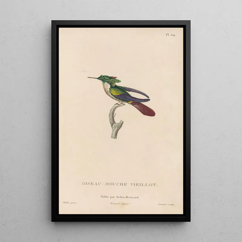Histoire naturelle des oiseaux-mouches Pl65 : een kleurrijk ballet van de natuur De kunstdruk Histoire naturelle des oiseaux-mouches Pl65 nodigt uit tot een duik in een levendige en delicate wereld. De vogels, met hun schitterende verenkleed, lijken te dansen op de wind. De compositie, zorgvuldig in balans gebracht, benadrukt heldere tinten groen, blauw en geel, en creëert een vrolijke en lichte sfeer. De graveertechniek die door René Primevère Lesson wordt gebruikt, maakt het mogelijk om de minutieuze details van deze fascinerende wezens vast te leggen, en eert hun vergankelijke schoonheid. Elk element van het doek lijkt te vibreren, alsof de vogels onder onze ogen tot leven komen, en een ware ode aan de natuur vormen. René Primevère Lesson : een pionier in artistieke ornithologie René Primevère Lesson, natuurkundige en illustrator uit de 19e eeuw, wist wetenschap en kunst op briljante wijze te combineren. Actief in een periode waarin de verkenning van soorten in volle gang was, werd hij beïnvloed door de ontdekkingen van zijn tijd en door de romantische beweging die de natuur waardeerde. Zijn werken, vooral in de Histoire naturelle des oiseaux-mouches, getuigen van zijn inzet om de vogelfauna getrouw weer te geven. Als lid van de Académie des sciences heeft Lesson bijgedragen aan de vooruitgang van ornithologische kennis, terwijl hij een blijvend artistiek erfgoed achterliet, waardoor hij een onmisbare figuur is in de naturalistische illustratie. Een decoratief stuk met vele voordelen De kunstdruk Histoire naturelle des oiseaux-mouches Pl65 is een decoratief stuk dat perfect past in diverse ruimtes, of het nu een woonkamer, een kantoor of een slaapkamer is. De kwaliteit van de afdruk en de trouw aan de originele details maken het een ideale keuze voor kunst- en natuurliefhebbers. Met zijn onmiskenbare esthetische aantrekkingskracht brengt deze doek een vleugje frisheid en kleur in uw interieur. Door voor dit kunstwerk te kiezen, kiest u voor een stuk dat niet alleen uw ruimte verfraait, maar ook de schoonheid en diversiteit van de natuurlijke wereld oproept, en uitnodigt tot contemplatie en verwondering.