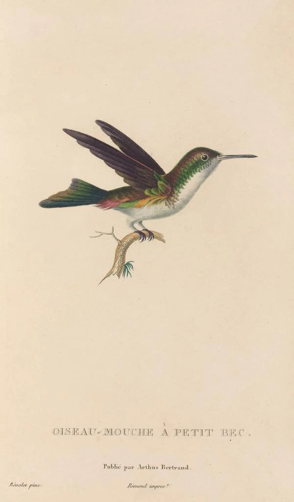 René Primevère Lesson, Franse naturalist en illustrator, wordt erkend voor zijn belangrijke bijdragen aan de ornithologie in de 19e eeuw. Zijn passie voor vogels en zijn wens om ze getrouw weer te geven, hebben hem ertoe gebracht iconische werken te creëren, waaronder deze kunstdruk Histoire naturelle des oiseaux-mouches Pl78. Geïnspireerd door de wetenschappelijke vooruitgang van zijn tijd, wist Lesson kunst en wetenschap te combineren, waardoor hij een nauwkeurig en poëtisch beeld van de natuur bood. Zijn werk heeft niet alleen het veld van de naturalistische illustratie verrijkt, maar ook het publiek bewust gemaakt van de schoonheid en diversiteit van vogelsoorten.