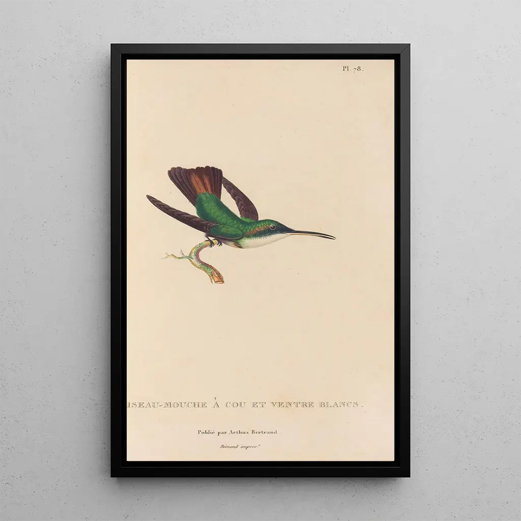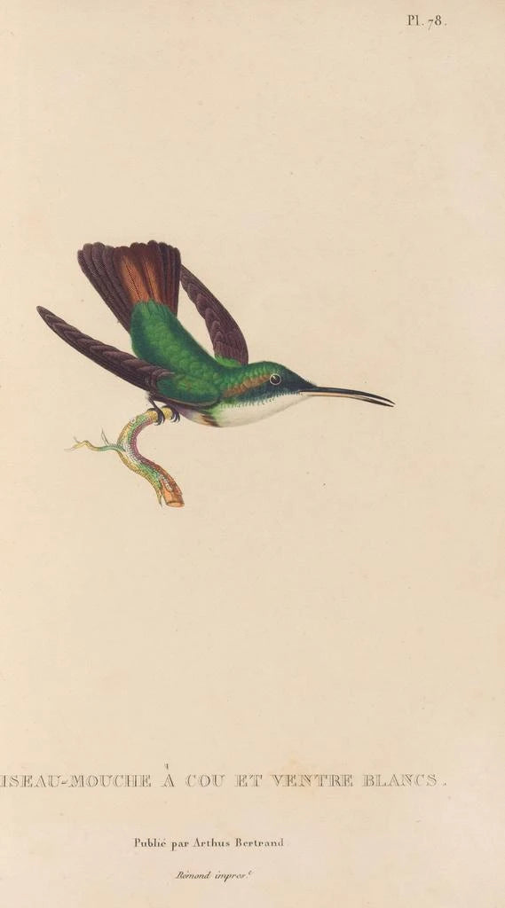 René Primevère Lesson, natuurkundige en ornitholoog uit de 19e eeuw, wist wetenschap en kunst te combineren in zijn werken. Actief in een periode waarin de studie van de natuur ongekende groei doormaakte, werd hij beïnvloed door de ontdekkingen van zijn tijdgenoten en door de romantische esthetiek die de schoonheid van de natuurlijke wereld waardeerde. Zijn illustraties, zoals die van de kunstdruk Histoire naturelle des oiseaux-mouches Pl79, getuigen van zijn inzet om de vogelfauna getrouw weer te geven terwijl hij hun poëtische essentie vastlegde. Dit werk maakt deel uit van een beweging die de ornithologie heeft gepopulariseerd en de status van natuurlijke kunstenaars heeft verhoogd.