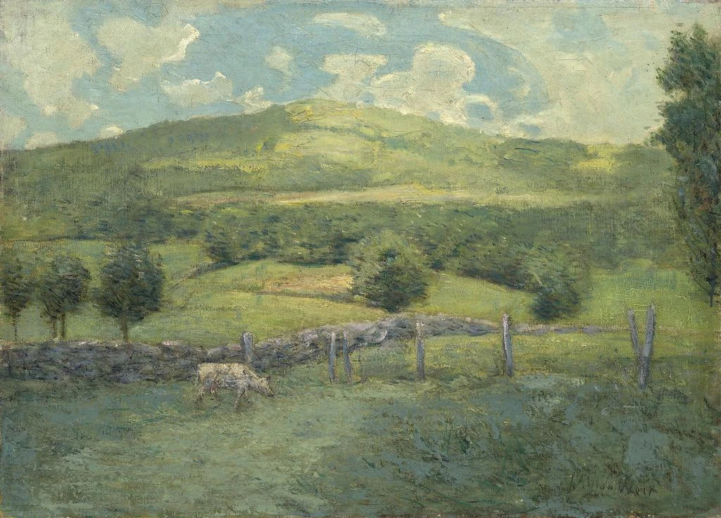 Julian Alden Weir, een iconische figuur van het Amerikaanse impressionisme, wist de schoonheid van landschappen vast te leggen met een unieke gevoeligheid. Actief aan het einde van de 19e eeuw en het begin van de 20e eeuw, werd hij beïnvloed door zijn Europese tijdgenoten terwijl hij een persoonlijke stijl ontwikkelde. Zijn reizen door de Verenigde Staten, vooral in Connecticut, voedden zijn inspiratie en brachten hem ertoe de nuances van licht en kleur te verkennen. Weir was ook een medeoprichter van de Society of American Artists, wat bijdroeg aan de opkomst van het impressionisme op Amerikaanse bodem.