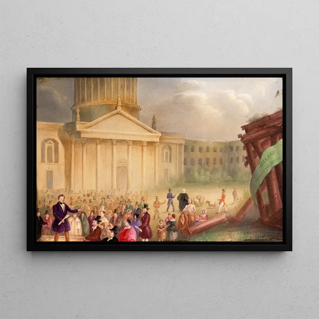 Ireland zonder opheffing: een echo uit het verleden Ireland zonder opheffing, anonieme kunstdruk, roept een turbulente periode uit de Ierse geschiedenis op via een aangrijpende compositie. De donkere kleuren en gestileerde vormen creëren een sfeer van melancholie en verzet. Dit doek, hoewel van onbekende oorsprong, slaagt erin de essentie vast te leggen van de politieke en sociale strijd die Ierland heeft gekenmerkt. De afgebeelde personages, met hun vastberaden uitdrukkingen, getuigen van een vurige wens naar vrijheid en rechtvaardigheid. Het werk nodigt uit tot reflectie over de gevolgen van politieke beslissingen en de impact van de geschiedenis op de nationale identiteit. Anoniem: een reflectie van de Ierse geschiedenis De anonieme kunstenaar van Ireland zonder opheffing heeft met zijn talent een belangrijk moment uit de Ierse geschiedenis weten te vereeuwigen. In een tijd waarin politieke spanningen alomtegenwoordig waren, weerkaatst dit werk de aspiraties van een volk op zoek naar emancipatie. Het ontbreken van een handtekening onderstreept de universele boodschap die wordt uitgedragen, waardoor elke kijker zich kan identificeren met de strijd voor vrijheid. De artistieke invloeden van die tijd, die realisme en symbolisme combineren, zijn terug te vinden in dit doek, dat een aangrijpend getuigenis blijft van de uitdagingen waarmee Ierland door de eeuwen heen werd geconfronteerd. Een decoratief kunstdruk met vele voordelen De kunstdruk van Ireland zonder opheffing is een waardevolle aanvulling op elke kunstcollectie. Of u nu een woonkamer, kantoor of slaapkamer wilt verfraaien, dit schilderij brengt een historische diepgang en reflectie over de verleden strijd. De kwaliteit van de reproductie garandeert een trouwheid aan de details en emoties van het originele werk, wat zorgt voor een verrijkende visuele ervaring. De esthetische aantrekkingskracht van dit doek ligt in zijn vermogen om discussies over de Ierse geschiedenis en cultuur te stimuleren, waardoor dit werk een ideale keuze is voor wie van geëngageerde en betekenisvolle kunst houdt.