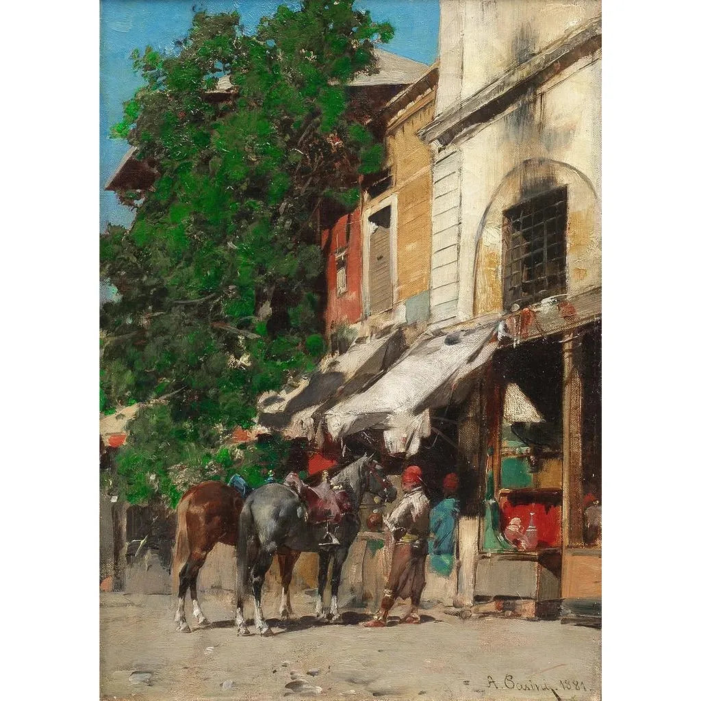 Alberto Pasini, Italiaanse kunstdruk kunstenaar uit de 19e eeuw, staat bekend om zijn werken die het Oosten en zijn exotische landschappen vieren. Geïnspireerd door zijn reizen door het Ottomaanse Rijk, wist hij de schoonheid en diversiteit van deze culturen te retranscriberen in zijn kunst. Zijn creatieve periode beslaat vooral de jaren 1850 tot 1880, waarin hij een unieke stijl ontwikkelde die realisme en romantiek combineert. Pasini was ook een actief lid van de orientalistische beweging, die erop gericht was de landen van het Oosten te representeren door een Europese lens. Zijn werken, waaronder Op de markt van Istanboel, getuigen van zijn vaardigheid om momenten van het dagelijks leven vast te leggen en tegelijkertijd de culturele rijkdom van deze regio's te eren.