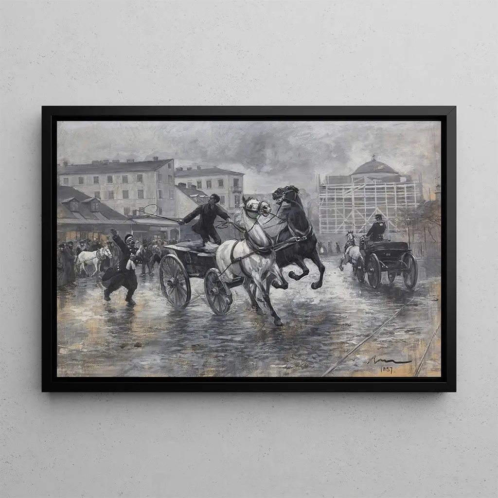 Op het Plein bij Aleksandra: een levendige scène van het stadsleven De kunstdruk van Op het Plein bij Aleksandra van Władysław Podkowiński vangt een dynamische en levendige sfeer. De heldere kleuren, variërend van diepe roodtinten tot rustgevende blauwen, roepen een zonnige dag op in een bruisende stad. De techniek van de kunstenaar, die realisme combineert met een impressionistische toets, brengt de personages die deze scène bevolken tot leven. De minutieuze details van de kleding en gezichtsuitdrukkingen voegen een menselijke dimensie toe, terwijl de evenwichtige compositie de blik door het kunstwerk leidt en uitnodigt om elke hoek van dit plein te verkennen. Władysław Podkowiński: een meester van beweging en emotie Władysław Podkowiński, actief aan het einde van de 19e eeuw, is een Poolse kunstenaar die bekend staat om zijn rol in de impressionistische beweging in Polen. Geïnspireerd door grote Europese meesters, ontwikkelde hij een unieke stijl die realisme en expressiviteit combineert. Zijn carrière, hoewel tragisch verkort, heeft een blijvende indruk achtergelaten op de Poolse kunst. Podkowiński heeft vaak thema's uit het dagelijks leven onderzocht, met als doel vluchtige momenten van emotie en schoonheid vast te leggen. Op het Plein bij Aleksandra is een perfect voorbeeld van zijn talent om het stadsleven met een aangrijpende gevoeligheid te vereeuwigen. Een decoratief stuk met vele voordelen De kunstdruk van Op het Plein bij Aleksandra is een ideaal decoratief stuk om je interieur te verrijken, of het nu in een woonkamer, kantoor of slaapkamer is. De afdrukkwaliteit garandeert een opmerkelijke fideliteit aan de kleuren en details van het originele kunstwerk, en brengt een vleugje elegantie en cultuur in je ruimte. De esthetische aantrekkingskracht van dit schilderij trekt de aandacht en stimuleert gesprekken, waardoor deze doek een perfecte keuze is voor liefhebbers van kunst en schoonheid. Door deze kunstdruk in je decoratie te integreren, geef je je omgeving een warme en inspirerende sfeer.