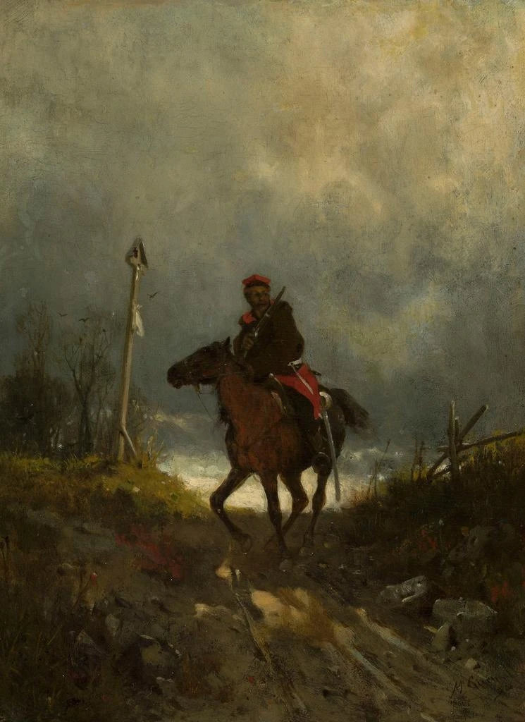 Maksymilian Gierymski, Poolse schilder uit de 19e eeuw, wordt erkend om zijn artistieke en politieke betrokkenheid. Geboren in 1846, beleefde hij ingrijpende gebeurtenissen, waaronder de opstand van januari 1863, die zijn werk diep heeft beïnvloed. Gierymski past binnen de stroming van het realisme, maar zijn stijl is ook doordrenkt met romantiek, waardoor hij intense emoties kan overbrengen. Zijn vermogen om historische momenten met zo'n intensiteit vast te leggen, maakt hem tot een belangrijke figuur in de Poolse kunst. "Insurgé de 1863" is een van zijn meest emblematische kunstwerken, dat de strijd voor vrijheid en nationale identiteit symboliseert.