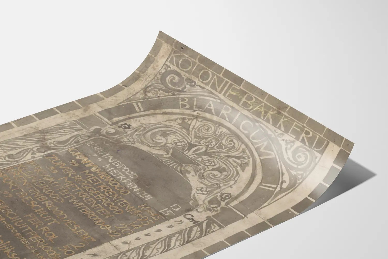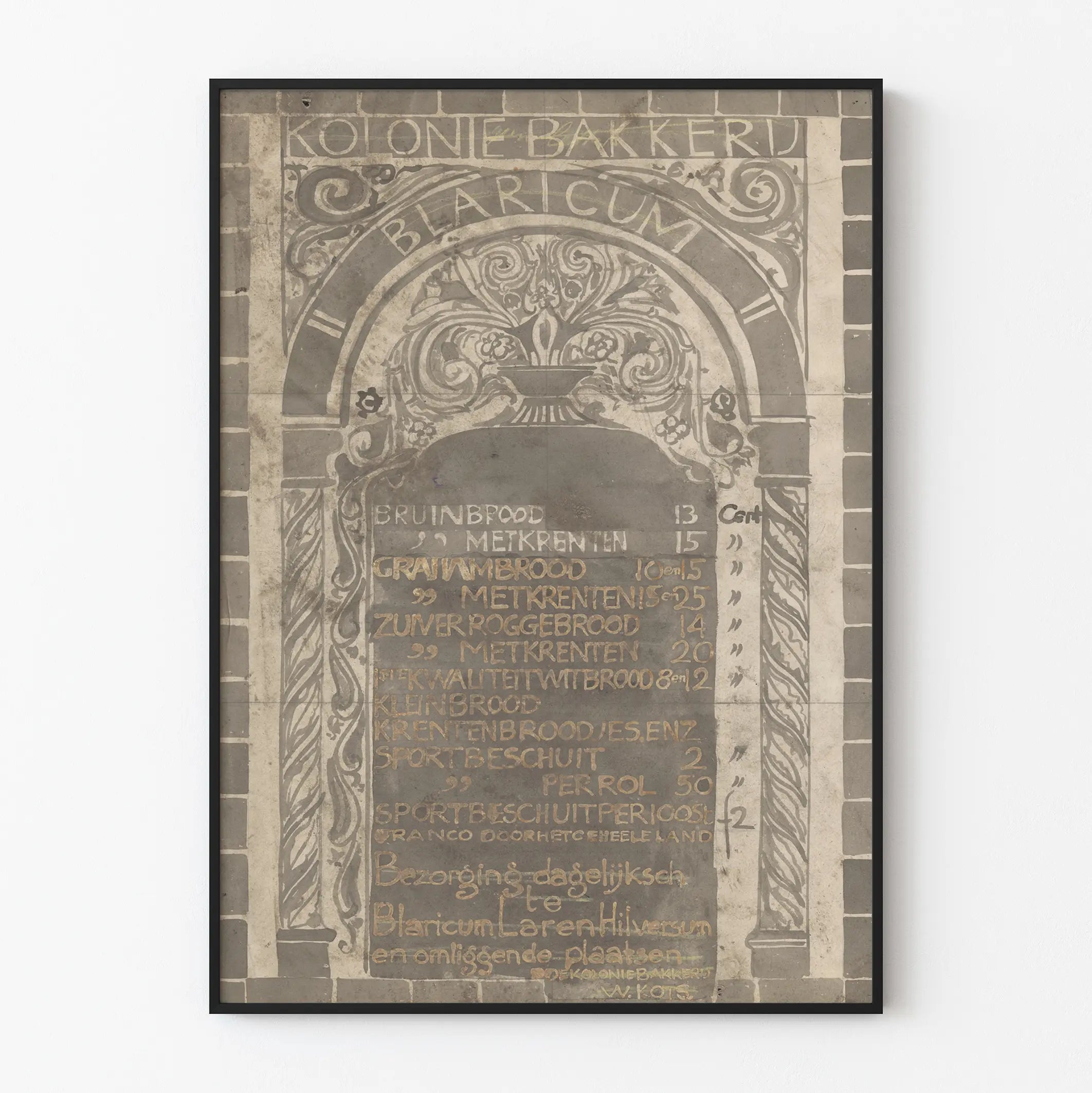 Deze vintage poster is een uniek wanddecoratiestuk, ideaal voor liefhebbers van authenticiteit en historische vormgeving. Ze toont een oude prijslijst van de bakkerij Kolonie Bakkerij in Blaricum, een dorp met uitgesproken architectuur en tradities. De poster is ingelijst door een gestileerd decor dat een bloemrijk boogmotief oproept, in nuances van grijs en beige, met een ambachtelijk uiterlijk op een lichte achtergrond. De inscripties in gouden en witte letters beschrijven diverse soorten brood en bakkerijproducten met hun prijzen, in een verzorgde en elegante typografie die doet denken aan een oude schrijfstijl. Onder de genoemde artikelen bevinden zich donkerbruin brood, boekweitbrood, wit brood van topkwaliteit, evenals verschillende varianten van sportbeschuit en kleine rozijnenbroodjes. Deze wandposter past perfect in een vintage, industriële of landelijke interieurstijl, en brengt een vleugje authenticiteit en charme uit vervlogen tijden. Ideaal als decoratief element in een keuken, café, bakkerij of elke ruimte gewijd aan gastronomie en ambachtelijk erfgoed. De retro uitstraling en de typografische inhoud maken er een subtiele maar karaktervolle decoratieposter van, die je kunt exposeren om de geschiedenis en sfeer van traditionele Nederlandse bakkerijen te herbeleven.