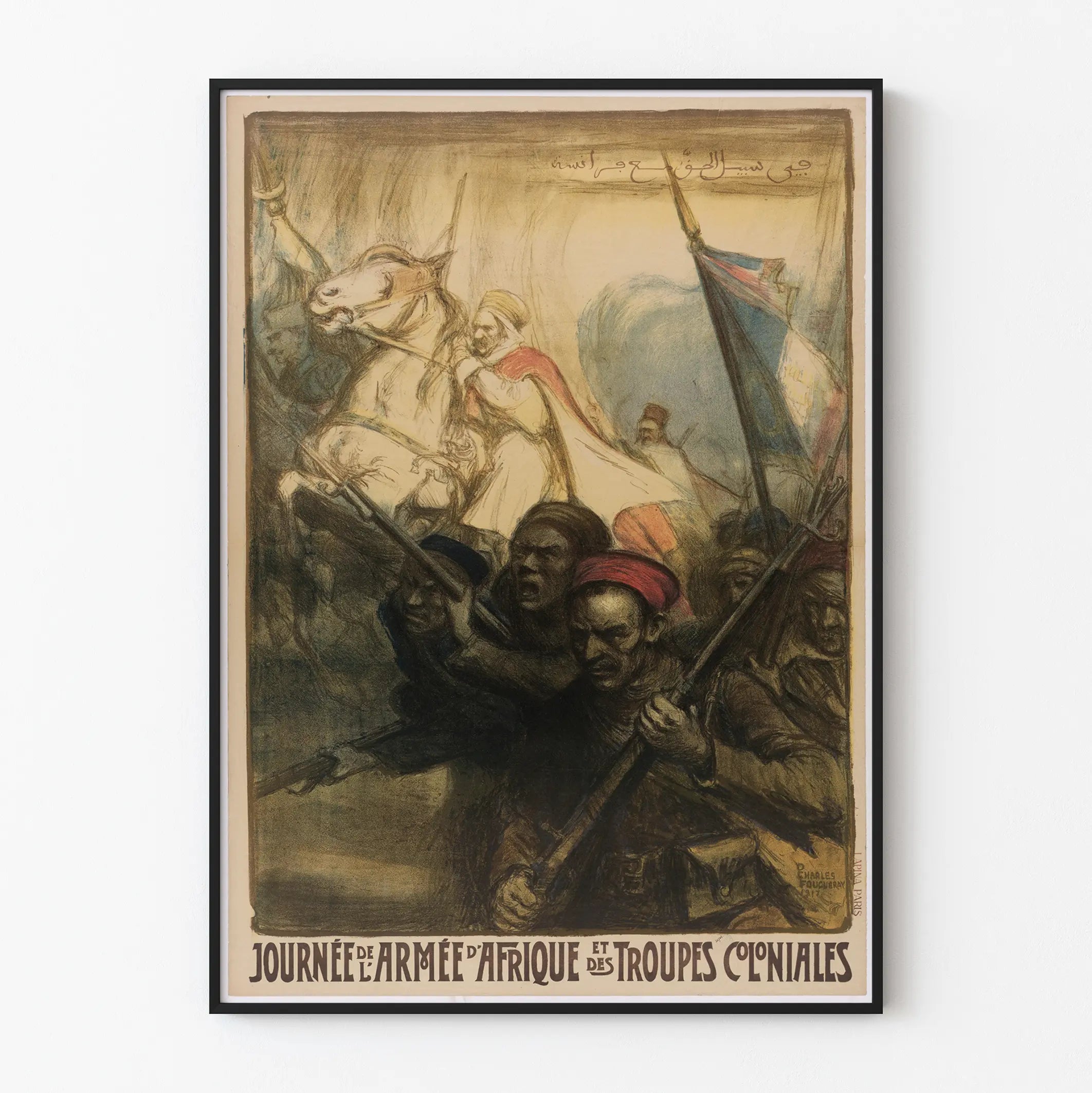 De artistieke details, zoals de nauwkeurige weergave van uniformen, wapens en de driekleurige vlag, versterken de authentieke en meeslepende dimensie van de poster. Elk personage drukt een intense emotie uit die de aandacht trekt en uitnodigt tot reflectie over de historische context van dit specifieke leger. De inscriptie in het Frans en de Arabische tekst bovenaan de poster voegen visuele en culturele rijkdom toe aan deze wandafbeelding.