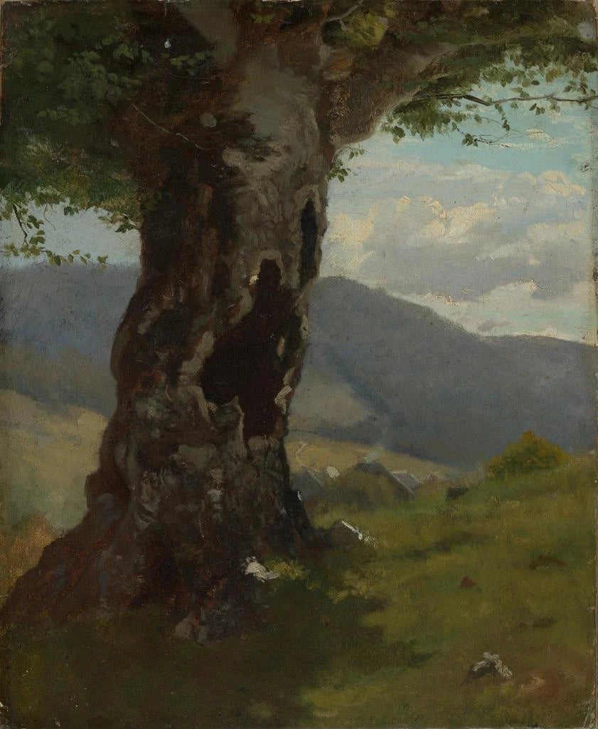Oud boomstam met uitzicht op de vallei - Hans Thoma