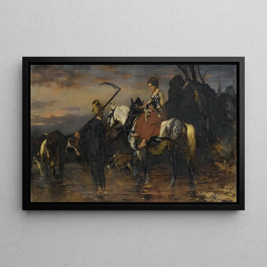Traversée de la rivière : een reis door het hart van de ongerepte natuur De doek "Traversée de la rivière" van Wilhelm von Diez roept een idyllisch tafereel op waarin de harmonie tussen mens en natuur zich op subtiele wijze ontvouwt. De zachte kleuren en de nuances van groen en blauw creëren een rustgevende sfeer, terwijl de olieverftechniek op doek het mogelijk maakt om het licht bijna magisch vast te leggen. De personages, in volle actie, lijken zich in een avontuur te bevinden, wat het idee van een verbondenheid met het omliggende landschap versterkt. Dit kunstwerk nodigt de kijker uit om te ontsnappen en de schoonheid van natuurlijke landschappen te bewonderen. Wilhelm von Diez : een meester van de Duitse romantiek Wilhelm von Diez, actief in de 19e eeuw, is een Duitse schilder wiens werk binnen de romantische beweging past. Geïnspireerd door landschappen en thema's uit het plattelandsleven, wist hij scènes te vangen die doordrenkt zijn van poëzie en gevoeligheid. Zijn carrière werd gekenmerkt door een constante zoektocht naar authenticiteit, met als doel de schoonheid van de natuurlijke wereld te weergeven en tegelijkertijd narratieve elementen te integreren. De romantische periode, gekenmerkt door een waardering van emoties en de natuur, heeft zijn stijl diep beïnvloed, waardoor hij een onmisbare kunstenaar van zijn tijd is geworden. Een decoratief kunstdruk met vele voordelen De kunstdruk van "Traversée de la rivière" is een ideale decoratieve keuze om uw interieur te verfraaien, of het nu in een woonkamer, kantoor of slaapkamer is. De kwaliteit van de reproductie en de trouw aan het originele kunstwerk garanderen een onmiskenbare esthetische aantrekkingskracht. Door deze doek in uw inrichting te integreren, brengt u een vleugje sereniteit en natuur in uw ruimte, terwijl u interesse en contemplatie opwekt. Dit kunstwerk is niet alleen een decoratief element, maar ook een uitnodiging tot dromen en ontsnapping.
