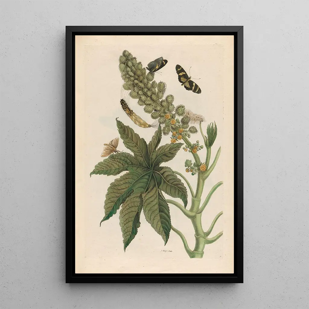 De doek "Palma Christi" van Maria Sibylla Merian roept een wereld op waarin natuur en geneeskunde samenkomen. Dit kunstdruk benadrukt de ricinusplant, bekend om haar medicinale eigenschappen, omgeven door een palet van zachte en rustgevende kleuren. De minutieuze details van de plant, gecombineerd met een harmonieuze compositie, creëren een sfeer van sereniteit en welzijn. De techniek van de gravure maakt het mogelijk om elke blad en bloem met opmerkelijke precisie weer te geven, waardoor de kijker wordt uitgenodigd zich onder te dompelen in Merian's botanische universum.