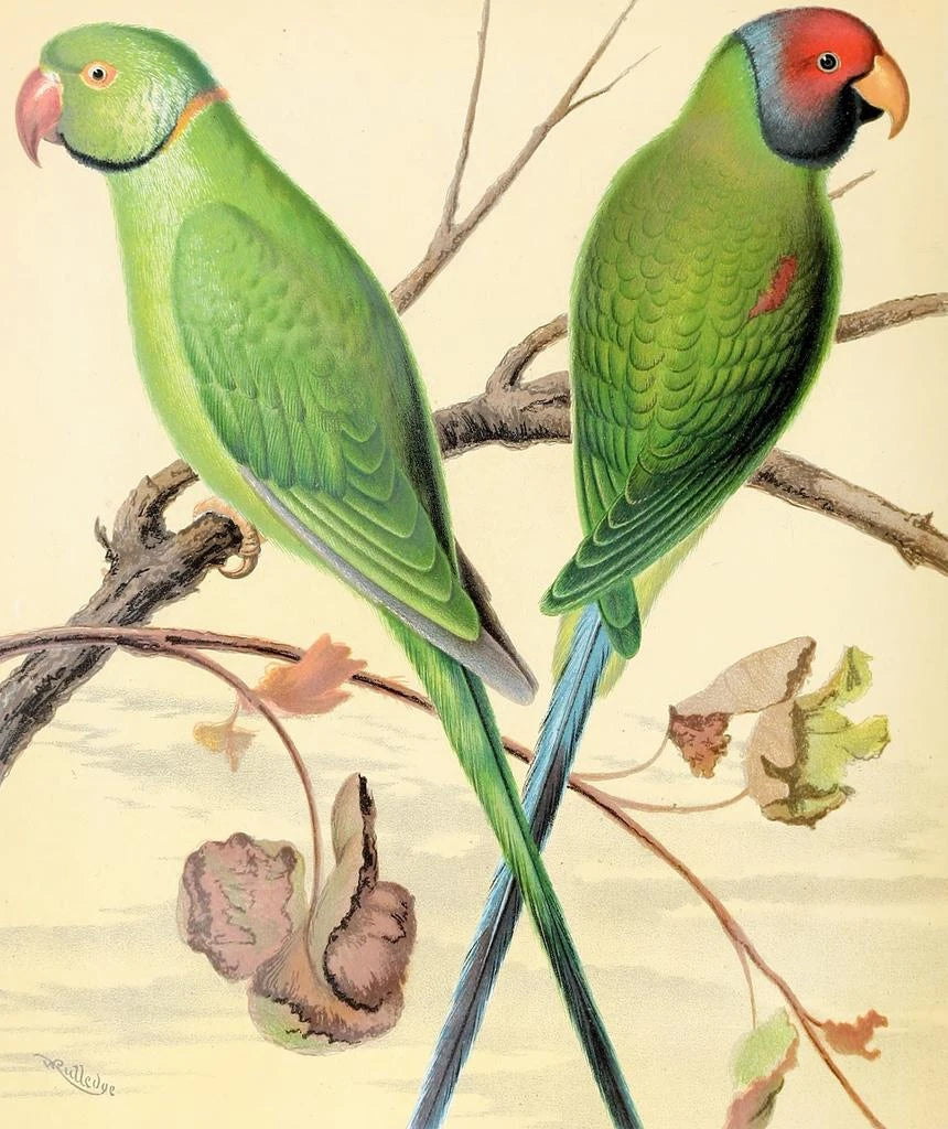 Kunstdruk van een ringhalsparkiet, pruimkopparkiet - W. A. Blakston