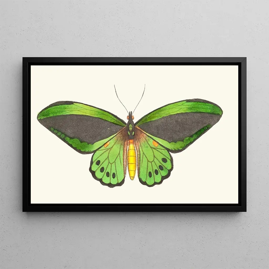 Papilio priamus : een ballet van kleuren en lichtheid De kunstdruk van Papilio priamus, een iconisch werk van George Shaw, dompelt ons onder in een levendige wereld waar de natuur bloeit. Dit schilderij, dat een majestueuze vlinder afbeeldt, onderscheidt zich door zijn heldere tinten groen, blauw en zwart, die een opvallend contrast creëren. De aquareltechniek, met finesse toegepast, geeft het werk een luchtige en delicate sfeer. De minutieuze details van de vleugels van de vlinder, bijna doorschijnend, lijken het licht te vangen en nodigen de kijker uit om de vergankelijke schoonheid van dit schepsel te bewonderen. Deze kunstdruk wordt zo een ware ode aan de natuur en de kwetsbaarheid van het leven. George Shaw : een pionier in de naturalistische illustratie George Shaw, Britse naturalist en illustrator uit de achttiende eeuw, speelde een cruciale rol in de wetenschappelijke illustratie van fauna en flora. Evoluerend in een tijd waarin wetenschappelijke verkenning in volle gang was, wist Shaw de diversiteit van de natuurlijke wereld vast te leggen met zijn werken. Geïnspireerd door de ontdekkingen van zijn tijd, droeg hij bij aan de kennis van exotische soorten, onder andere door zijn illustraties van vlinders. Zijn werk heeft niet alleen de wetenschappelijke kennis verrijkt, maar heeft ook vele kunstenaars geïnspireerd. De kunstdruk van Papilio priamus getuigt van zijn talent en zijn inzet voor de schoonheid van de natuur. Een decoratief stuk met vele voordelen Kiezen voor de kunstdruk van Papilio priamus betekent kiezen voor een decoratief stuk dat uw interieur zal verfraaien. Of het nu in een woonkamer, kantoor of slaapkamer is, dit schilderij brengt een vleugje elegantie en frisheid. De kwaliteit van de afdruk garandeert een trouwheid aan de kleuren en details van het originele werk, wat een onmiskenbare esthetische aantrekkingskracht biedt. Door deze doek in uw inrichting te integreren, creëert u een ruimte waar natuur en kunst samenkomen, uitnodigend tot contemplatie en ontsnapping. Deze kunstdruk is niet alleen een artistieke keuze, maar ook een manier om een serene en inspirerende sfeer aan uw omgeving toe te voegen.