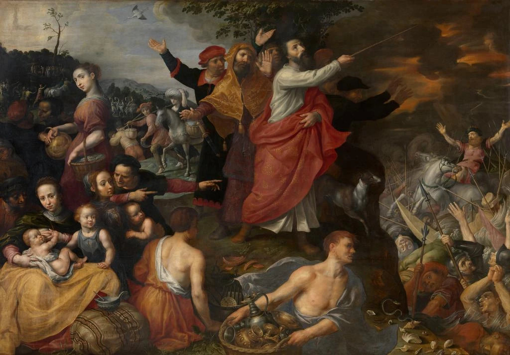 Le tableau "Passage à travers la mer Rouge" de Marten Pepijn évoque une scène grandiose et dramatique, où les eaux tumultueuses semblent se séparer pour laisser place à un chemin. Les couleurs vibrantes, allant des bleus profonds aux rouges éclatants, créent une atmosphère à la fois mystique et captivante. La technique de Pepijn, mêlant peinture à l'huile et touches de lumière, donne vie à cette scène biblique, où la puissance divine est palpable. Les personnages, figés dans un moment d'émerveillement, ajoutent une dimension humaine à cette aventure mythique, invitant le spectateur à ressentir l'intensité de l'instant.