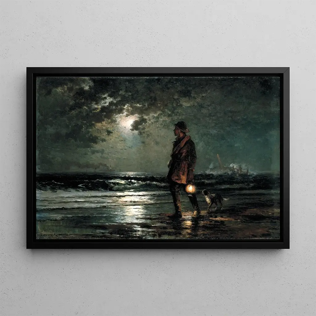 Edward Moran, geboren in 1829, is een Amerikaanse schilder die bekend staat om zijn maritieme werken. Geïnspireerd door de grote Europese meesters, ontwikkelde hij een unieke stijl die precisie en emotie verenigt. Actief vooral in de 19e eeuw, heeft hij de schoonheid en de gevaarlijkheid van de zee vastgelegd en werd hij een iconisch figuur binnen de Amerikaanse kunstbeweging. Zijn werken, vaak geïnspireerd door historische gebeurtenissen of verhalen over moed, getuigen van het belang van de zee in de collectieve verbeelding van zijn tijd. "Patrouille de sauvetage" past perfect binnen deze traditie en viert zowel heldenmoed als de majesteit van de natuur.