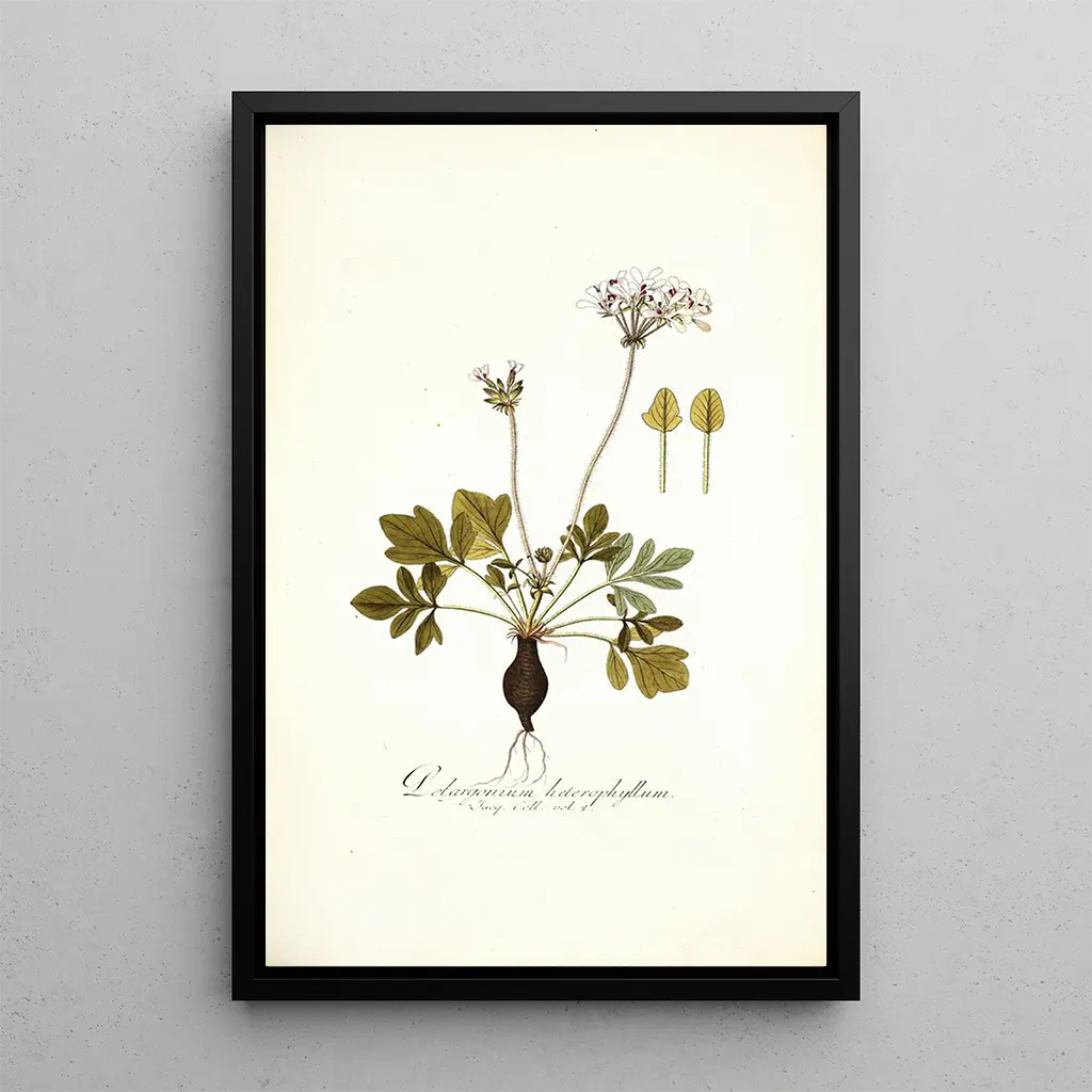 De kunstdruk Pelargonium heterophyllum, gemaakt door Nikolaus Joseph Freiherr von Jacquin, is een viering van de rijkdom van de flora. Dit werk, doordrenkt met verfijning, toont bladeren in diverse vormen en levendige kleuren die de aandacht trekken. De aquareltechniek, met finesse toegepast, brengt de transparantie van de bloemblaadjes en de textuur van de bladeren tot leven, waardoor een sfeer ontstaat die zowel levendig als rustgevend is. Elk detail wordt zorgvuldig bestudeerd, wat getuigt van een passie voor botanica en een verlangen om de schoonheid van de natuur te delen.