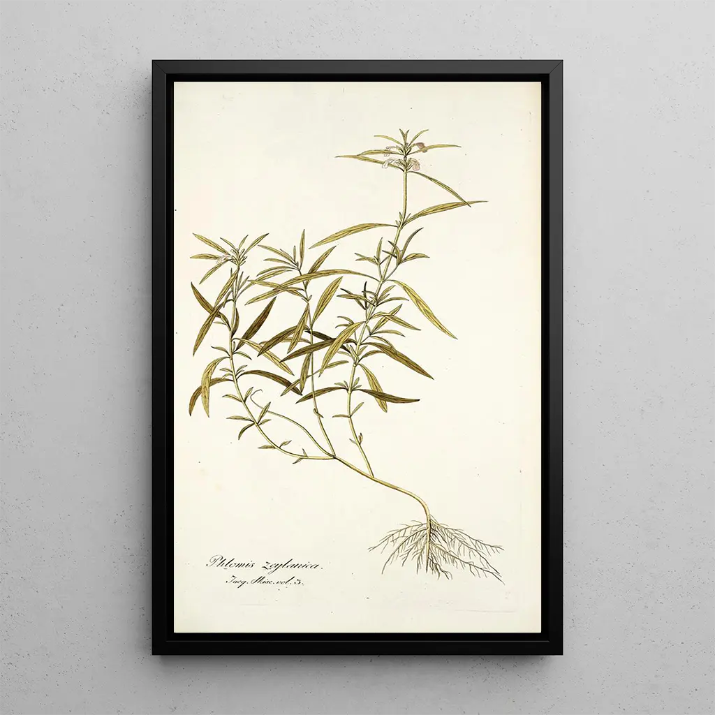 De kunstdruk van Phlomis zeylanica, vervaardigd door Nikolaus Joseph Freiherr von Jacquin, is een ware ode aan de schoonheid van de planten van Ceylon. Met zijn zachte tinten en delicate vormen nodigt dit werk uit tot het ontdekken van een rijke en gevarieerde plantwereld. De gedetailleerde weergave van de bladeren en bloemen, uitgevoerd met een verfijnde aquareltechniek, creëert een rustgevende en contemplatieve sfeer. Elke penseelstreek onthult de minutieuze observatie van Jacquin, die ons meeneemt naar de weelderige tuinen van het eiland.
