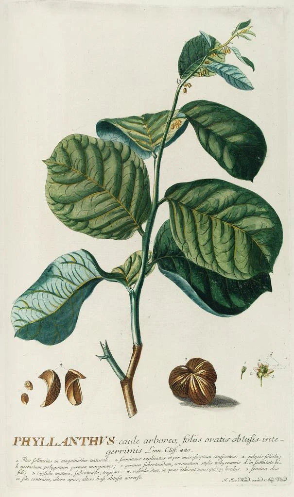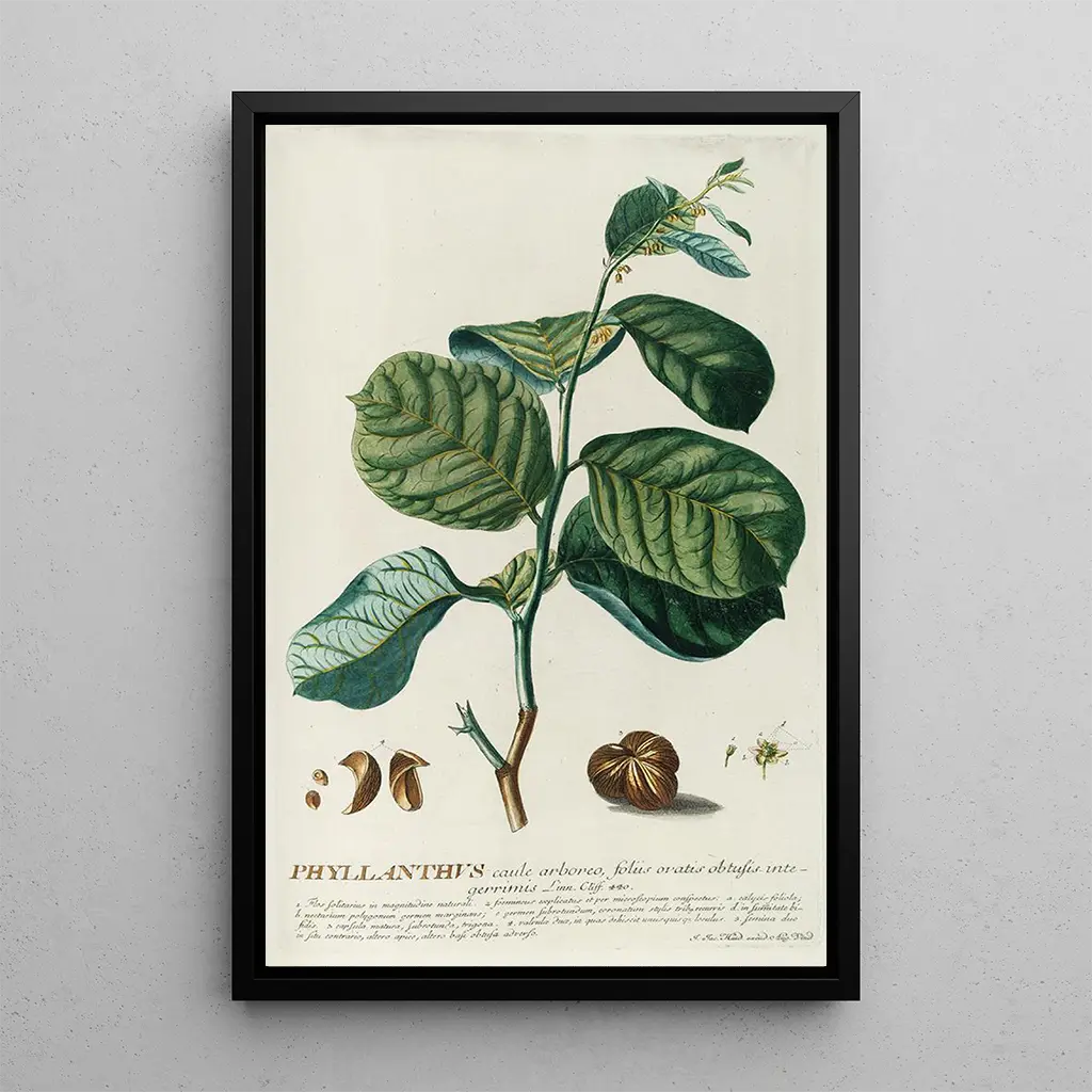 De kunstdruk van PhylIanthus, een fascinerend werk van Georg Dionysius Ehret, brengt ons in een wereld waar plantendiversiteit in de schijnwerpers staat. De delicate nuances van de bladeren en bloemen, zorgvuldig geïllustreerd, onthullen de complexiteit en schoonheid van deze plant. De graveertechniek die door Ehret wordt gebruikt, stelt hem in staat om texturen en details met opmerkelijke precisie vast te leggen. De sfeer die van dit doek uitgaat, is zowel rustgevend als stimulerend, en nodigt uit tot een visuele verkenning van de wonderen van de natuur. Elk element van de compositie lijkt te vibreren van een eigen leven, en boeit het oog en de verbeelding.