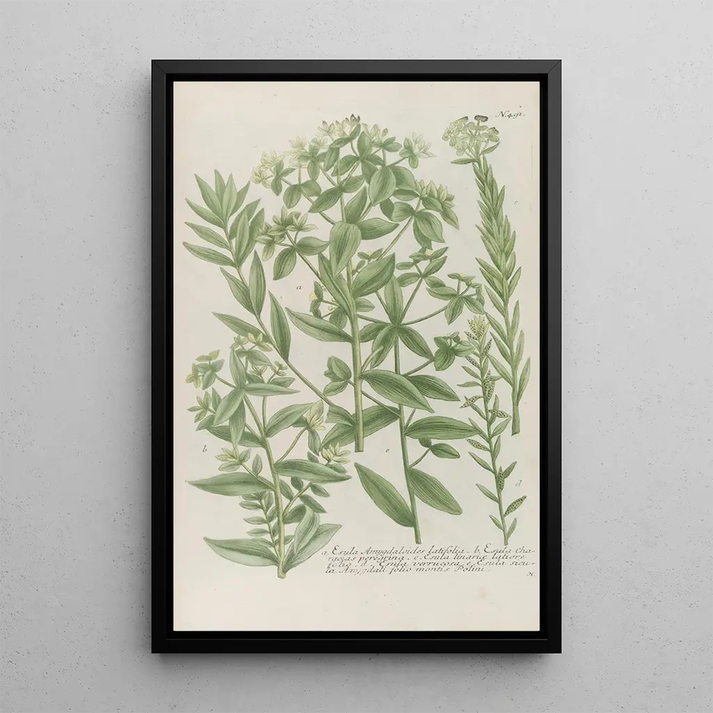 De kunstdruk van het werk Phytanthoza iconographia Pl214 dompelt ons onder in een rijke en kleurrijke plantenwereld. De minutieuze details van de planten, prachtig weergegeven, onthullen een palet van levendige kleuren die variëren van stralend groen tot delicate nuances van roze en geel. De graveertechniek, gecombineerd met een subtiele aquarel, creëert een sfeer die zowel wetenschappelijk als poëtisch is, en nodigt de kijker uit om de schoonheid van de natuur te verkennen. Elk element is zorgvuldig samengesteld, wat resulteert in een harmonieuze compositie die de aandacht trekt en de verbeelding stimuleert.