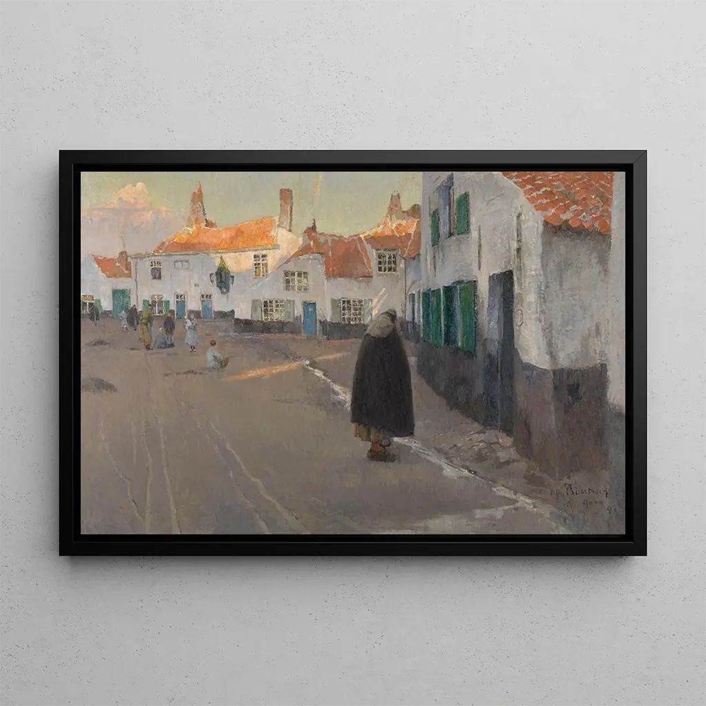 De kunstdruk van Place en Flandre brengt ons naar een pittoresk landschap, waar rust de boventoon voert. Dit schilderij, met zijn zachte tinten en nuances van groen, roept een scène van vredig leven op in een Vlaams dorp. De details van de gebouwen en de personages, met zorg geschilderd, creëren een warme en uitnodigende sfeer. Het zachte licht dat de scène baadt, voegt een poëtische dimensie toe, die uitnodigt tot dromen en ontsnapping. Elk element van de compositie lijkt een verhaal te vertellen, dat van een eenvoudig en authentiek leven.