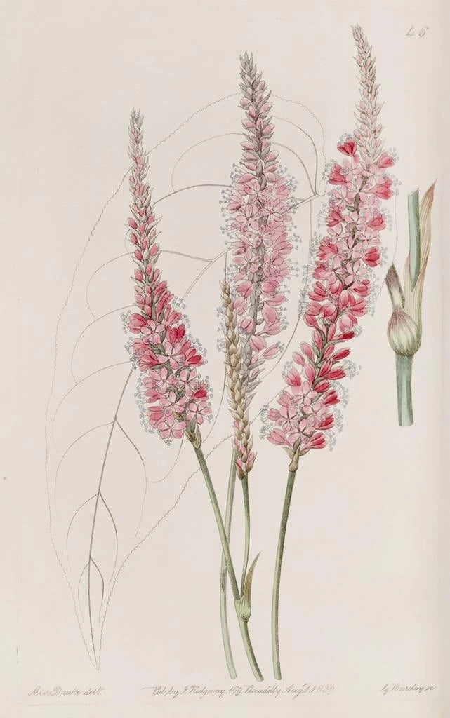 Le tableau "Polygonum à tige embrassante" de Sydenham Edwards est une œuvre vibrante qui capte l'essence de la nature. Les teintes vertes et roses se mêlent harmonieusement, créant une atmosphère à la fois délicate et dynamique. La technique de l'aquarelle, utilisée avec maestria, permet de rendre les détails des feuilles et des tiges avec une précision remarquable. Chaque coup de pinceau semble insuffler une vie nouvelle à la plante, invitant le spectateur à une contemplation attentive. L'œuvre évoque un jardin luxuriant où la beauté des formes naturelles s'épanouit dans un ballet de couleurs.
