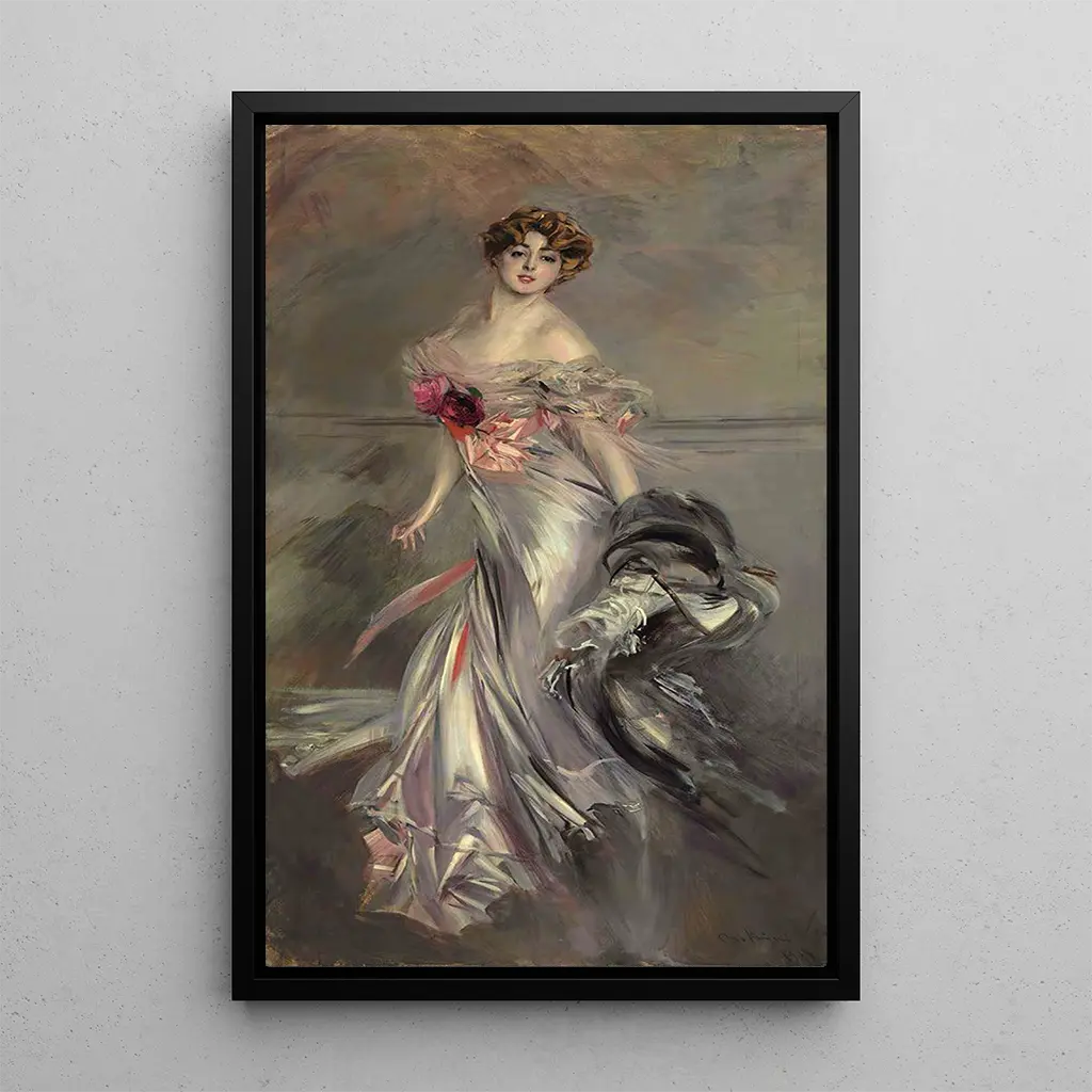 Portrait de Marthe Régnier : een ode aan de vrouwelijke schoonheid De kunstdruk "Portrait de Marthe Régnier" van Giovanni Boldini vangt de essentie van vrouwelijke schoonheid door middel van een dynamische compositie en levendige kleuren. Het doek beeldt Marthe Régnier af in een elegante pose, omhuld door vloeiende plooien die bijna lijken te dansen om haar heen. De gewaagde penseelstreken en de impressionistische techniek geven het werk een levendige sfeer, waarin het licht een essentiële rol speelt en de delicate trekken van het gezicht van het model accentueert. Boldini, meester in portretkunst, slaagt erin niet alleen de uitstraling van Marthe vast te leggen, maar ook haar geest en persoonlijkheid, waardoor het een ware uitnodiging tot contemplatie wordt. Giovanni Boldini : de virtuoos van het portret in het tijdperk van de Belle Époque Giovanni Boldini, geboren in 1842 in Italië, vestigde zich snel als een van de meest vooraanstaande portretkunstenaars van de Belle Époque. Geïnspireerd door de impressionistische beweging en de rococo-stijl, ontwikkelde hij een unieke techniek die elegantie en moderniteit combineert. Zijn kunstdrukken, vaak van vrouwen uit de hogere kringen, onthullen een fascinatie voor de mode en glamour van zijn tijd. Boldini wist de geest van zijn tijd te vangen en werd zo een bevoorrecht getuige van het sociale en artistieke leven aan het einde van de 19e eeuw. Zijn werk, waarvan "Portrait de Marthe Régnier" een emblematisch voorbeeld is, blijft kunstenaars en kunstliefhebbers inspireren en fascineren. Een decoratief kunstdruk met vele troeven De kunstdruk van "Portrait de Marthe Régnier" is een decoratief stuk dat uw interieur zal verrijken, of het nu in een woonkamer, kantoor of slaapkamer is. De kwaliteit van de afdruk en de trouw aan de originele kleuren garanderen een uitzonderlijke esthetische uitstraling, die een vleugje verfijning aan uw decoratie toevoegt. Door te kiezen voor deze kunstdruk, kiest u voor een werk dat niet alleen een ruimte verfraait, maar ook een verhaal vertelt, dat van een vervlogen tijdperk waarin elegantie en charme centraal stonden. Deze kunstdruk is veel meer dan een eenvoudige decoratie; het is een ware uitnodiging tot ontsnapping en dagdroom.