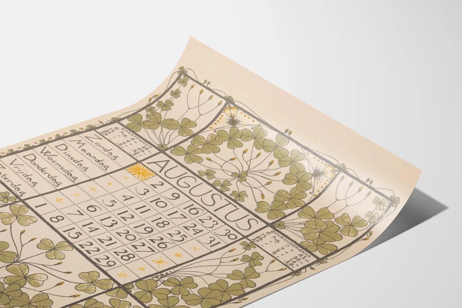 Ontdek deze decoratieve kalenderposter van augustus 1896, een opvallend voorbeeld van de Art Nouveau-stijl met zijn delicate plantmotieven. Deze muurdecoratie toont een maandkalender omgeven door illustraties van klavers en knoppen met vloeiende, elegante lijnen, kenmerkend voor deze artistieke periode. Elke dag van de maand is vermeld in een heldere en leesbare raster, gecombineerd met gekleurde zonnesymbolen in geel om bepaalde data te markeren. De tekst is geschreven in het Nederlands, wat een vintage charme en historische authenticiteit aan deze kalenderposter toevoegt. De omlijsting van de tekening integreert harmonieus de bloemrijke elementen, wat zorgt voor een visueel evenwicht en het decoratieve karakter van de affiche versterkt. Dit stuk is perfect voor een verfijnde muurdecoratie, ideaal voor liefhebbers van geschiedenis, decoratieve kunst of voor wie op zoek is naar een origineel schilderij dat functionaliteit en esthetiek combineert. Of het nu in een kantoor, bibliotheek of woonkamer hangt, deze poster nodigt uit tot een tijdreis, versterkt door zijn natuurlijke grafische stijl en zachte tinten van groen en geel. Een affiche die de klassieke elegantie en het vintage ontwerp op uw muren benadrukt, voor een warme en verfijnde sfeer.