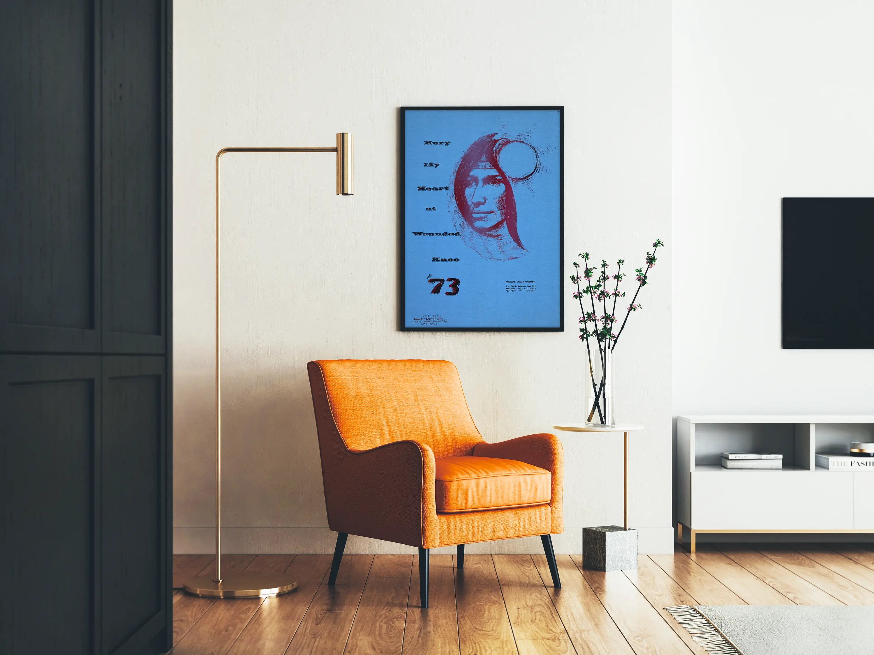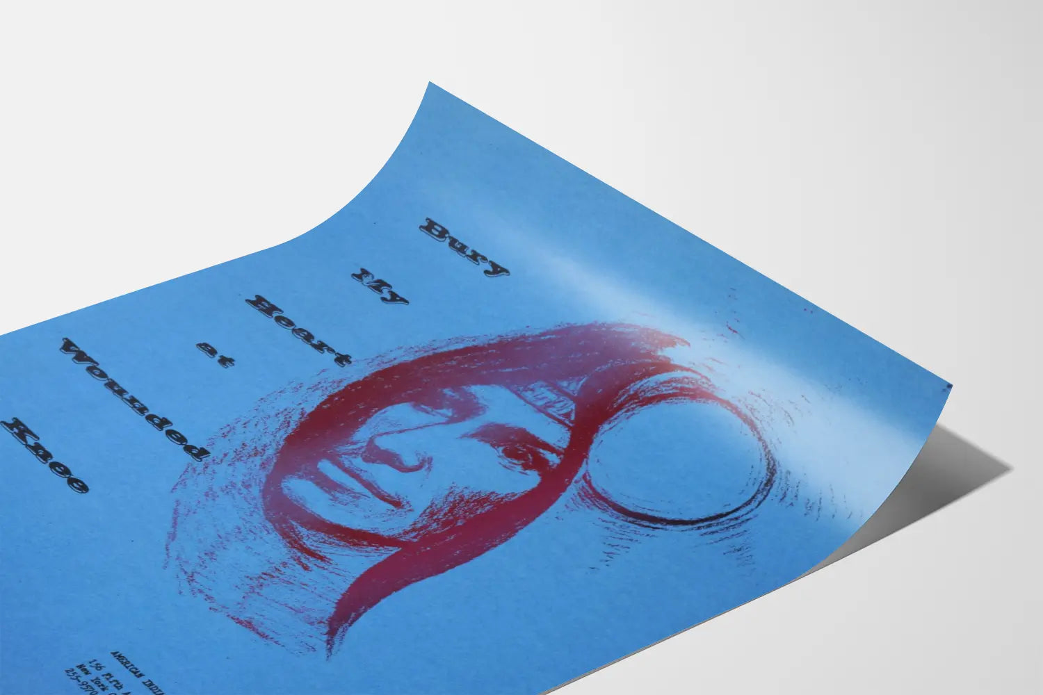 Deze sobere en krachtige affiche getiteld "Bury My Heart at Wounded Knee 73" toont een gestileerd portret van een indiaans gezicht, getekend in roodtinten op een egale blauwe achtergrond. De minimalistische compositie combineert een expressief schets van een man met een hoofdband en een symbolisch rondje rechts, wat een sfeer van reflectie en herinnering oproept. De tekst in zwarte letters, verticaal links geplaatst, in een typografische stijl die doet denken aan een typemachine, versterkt het historische en betrokken karakter en verwijst duidelijk naar de indiaanse strijd. Deze poster is een ideale muurdecoratie om een culturele en artistieke toets toe te voegen aan een modern interieur, terwijl het een diepgaand en emblematisch onderwerp oproept. Dit soort affiches leent zich bijzonder goed voor ingelijste presentatie in een woonkamer, kantoor of tentoonstellingsruimte, en benadrukt het belang van herinnering en sociale rechtvaardigheid door middel van grafische kunst. De eenvoudige lijnen en het beperkte kleurenpalet maken een moeiteloze integratie mogelijk in diverse decoratiestijlen, of het nu gaat om een minimalistisch, etnisch of vintage interieur.