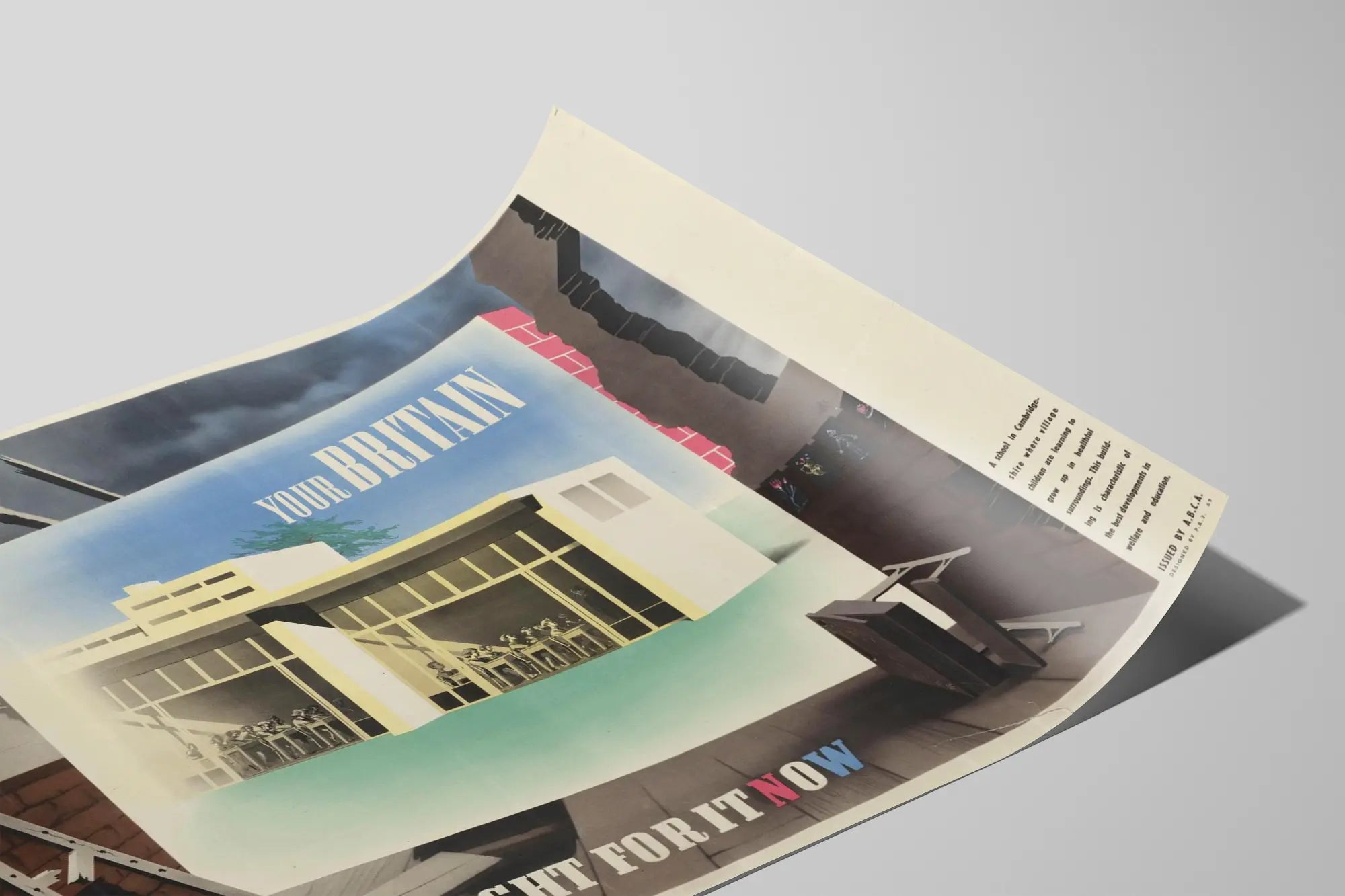 Deze vintage poster getiteld « Your Britain Fight For It Now » toont een moderne school in Cambridgeshire, met een krachtige boodschap over onderwijs en sociale ontwikkeling. Het beeld van een lichte en functionele klasruimte benadrukt de vooruitgang op het gebied van welzijn en onderwijs, en herinnert aan het belang van kwalitatieve schoolinfrastructuur in Britse dorpen. De poster contrasteert de moderniteit van de school, waar kinderen in rijen zitten onder een heldere kubistische architectuur, met een vervallen en sombere omgeving op de voorgrond, die de uitdagingen en de dringende noodzaak tot actie voor betere leeromstandigheden symboliseert.