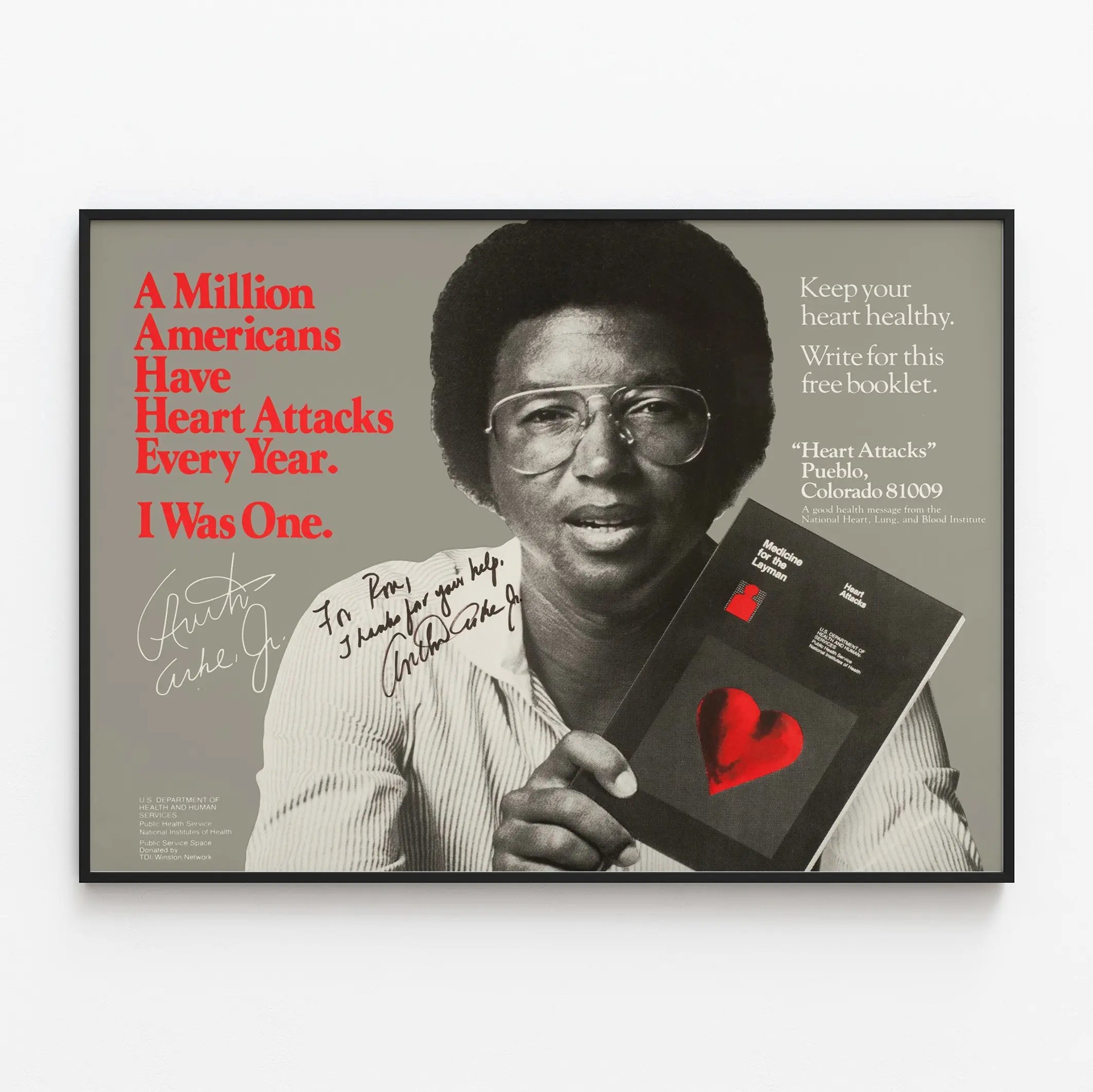 Deze vintage poster over bewustwording van hartziekten vestigt de aandacht op een cruciale volksgezondheidsboodschap: jaarlijks lijden een miljoen Amerikanen aan een hartaanval. Het beeld toont een zwart-witportret van een man met een bril, die een boekje vasthoudt met de titel « Medicine for the Layman » over hartaanvallen. De felrode en krachtige tekst « A Million Americans Have Heart Attacks Every Year. I Was One. » benadrukt de ernst van het probleem en geeft tegelijkertijd een krachtig persoonlijk getuigenis.