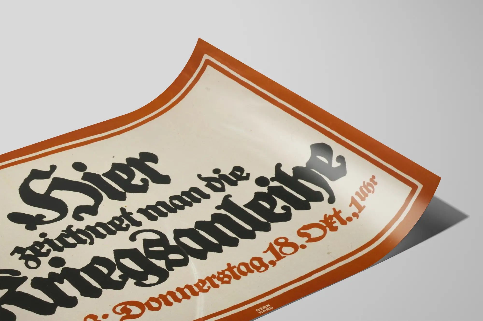 Deze vintageposter "Hier Zeichnet Man Die Kriegsanleihe" is een opvallend stuk voor elke collectie of muurdecoratie met een historische inspiratie. Het grafisch ontwerp onderscheidt zich door een imposant gotisch lettertype, waarbij het diepe zwart contrasteert met een kader en een tekst in brandoranje, waardoor een intense en suggestieve sfeer uit een vervlogen tijd ontstaat. Deze poster reproduceert een visuele communicatiestijl die werd gebruikt om aan te moedigen tot het onderschrijven van oorlogsleningen, een onderwerp dat vaak werd onderzocht in reclameteksten en politieke affiches uit conflictperioden.