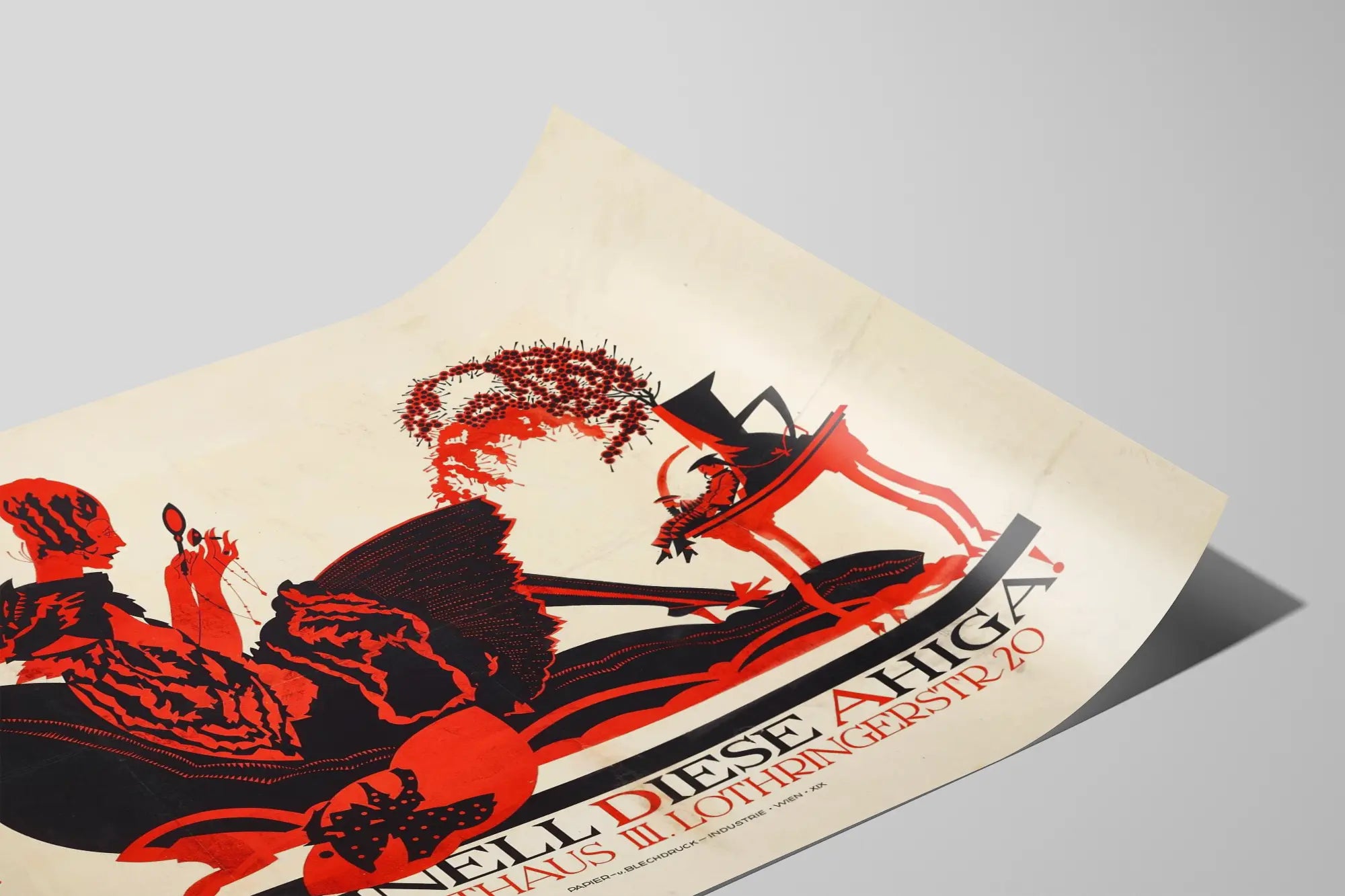 Deze vintage affiche getiteld "Originell Diese Ahiga" is ondertekend door Klinger en dateert uit 1922. Ze toont een grafische stijl gekenmerkt door het gebruik van silhouetten in zwart en rood, waardoor deze wanddecoratie een eigentijdse en intrigerende uitstraling krijgt. In het midden van de afbeelding bevindt zich een vrouwelijke figuur zittend, gekleed in gestileerde geometrische vormen, die lijkt te worden gemanipuleerd door een kleine spiegel, wat een vleugje mysterie en esthetische reflectie toevoegt aan het geheel. Rechts, een vaas versierd met bessen en een miniatuurbeeld van een liggende man op een tafel completeren de compositie, waarbij een subtiel evenwicht wordt geschetst tussen menselijke en decoratieve elementen. Deze oude affiche is ideaal voor liefhebbers van wanddecoratie die een vleugje originaliteit en grafische kunst in hun interieur willen brengen. De keuze voor zwart en rood creëert een opvallend contrast dat de aandacht trekt en de muurruimte dynamiseert. Door deze poster in een woonkamer, kantoor of galerie te plaatsen, benadrukt u niet alleen een art deco-stijl, maar ook een strakke en krachtige grafische creatie. De inscriptie met de locatie "Konzerthaus III. Lothringerstr 20" voegt een historische en lokale dimensie toe aan dit stuk, waardoor deze affiche interessant is voor zowel verzamelaars als liefhebbers van authentieke wanddecoraties. Dit grafische kunstwerk onderscheidt zich door zijn vermogen om abstract en figuratief te combineren met grote soberheid, waardoor het een veelzijdig en tijdloos decoratief object is. Perfect voor een modern of retro interieur, stelt deze decoratieve affiche u in staat een originele artistieke sfeer te creëren, terwijl het een minimalistische en geometrische esthetiek respecteert. Of het nu voor een privécollectie is of om de wanddecoratie van een leefruimte te versterken, deze vintage poster is een opvallend stuk dat de aandacht trekt en uitnodigt tot contemplatie. Door een evenwicht te zoeken tussen vormen en kleuren, past ze moeiteloos in diverse interieurstijlen en geeft ze karakter en persoonlijkheid aan uw inrichting.