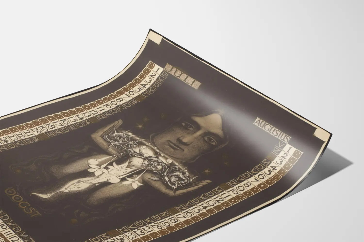 Ontdek deze vintage kalenderposter die de maanden juli, augustus en september 1924 beslaat, een uniek stuk om in uw muurdecoratie te integreren. Deze poster onderscheidt zich door zijn retro-esthetiek, met een diepe zwarte achtergrond gecombineerd met grafische elementen in sepia- en crèmetinten die een centraal portret omlijsten. De kalender is aan de randen geplaatst, met de dagen genummerd en hun initialen, verticaal georganiseerd voor juli en augustus en horizontaal onderaan voor september.