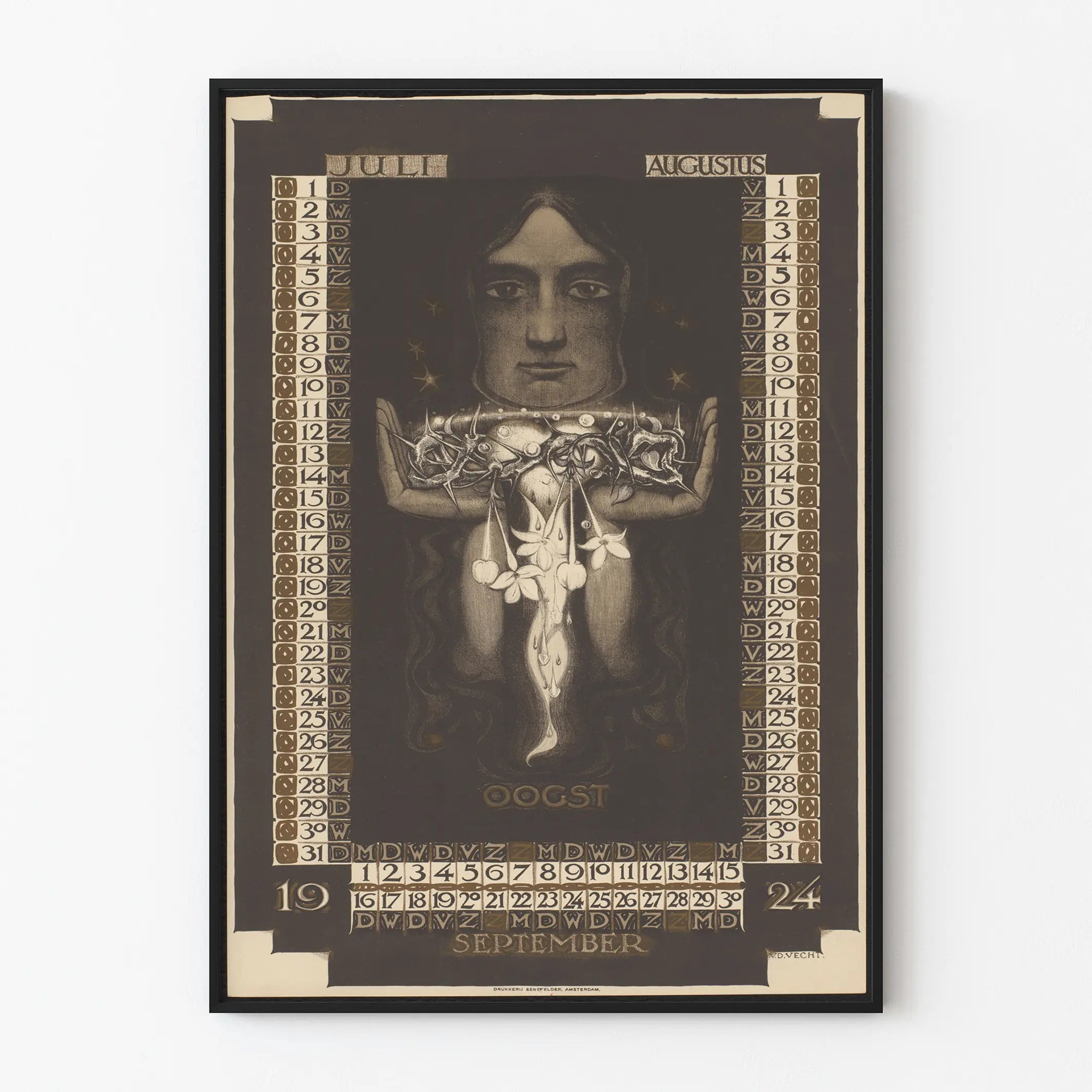 Breng een sfeer van vroeger in uw interieur met deze decoratieve poster van een zomerkalender uit 1924, perfect om elke decoratieve ruimte te verrijken met een artistiek accent en een tijdloze charme.