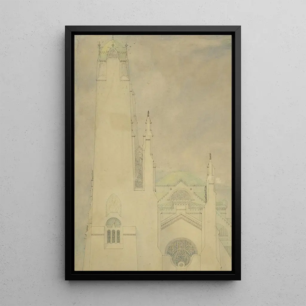 Dans "Projet pour une église", Marius Bauer nous offre une représentation fascinante d'un espace sacré en devenir. Les lignes architecturales s'entrelacent avec harmonie, créant un équilibre entre la structure et l'environnement. Les nuances de bleu et de beige évoquent à la fois la sérénité et la grandeur, tandis que les détails minutieux des ornements suggèrent une attention particulière portée à chaque élément. Cette œuvre transcende le simple dessin architectural pour devenir une véritable invitation à la contemplation spirituelle, où l'art et la foi se rencontrent.