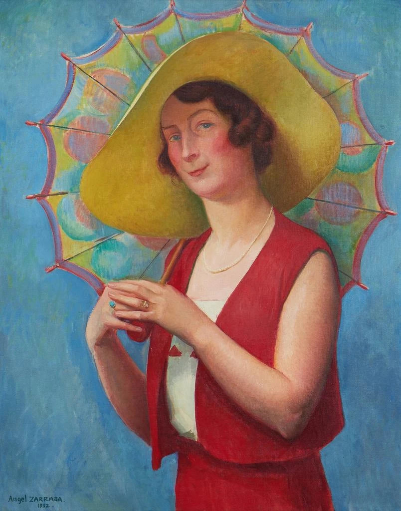 Het palet van Zárraga, gedomineerd door warme en matte tinten, geeft het doek een sfeer die zowel intiem als verfijnd is. De parasol, een terugkerend motief in de moderne schilderkunst, wordt hier een symbool van schaamte en mysterie, wat de emotionele diepte van het portret versterkt.