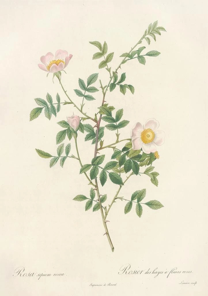 De kunstdruk van Rosa Sepium Rosea, een iconisch werk van Pierre Joseph Redouté, dompelt ons onder in een wereld van zachtheid en lichtheid. De bloemblaadjes, in een zachte roze tint, bloeien gracieus, terwijl de groene nuances van de bladeren een rustgevend contrast creëren. De aquareltechniek, beheerst door Redouté, geeft dit doek een ongeëvenaarde helderheid, bijna etherisch. Elk detail, van dauwdruppels tot de nerven van de bladeren, wordt met precisie weergegeven die uitnodigt tot contemplatie. De algemene sfeer van het werk roept een geheime tuin op, een plek waar natuurlijke schoonheid zonder beperkingen bloeit.